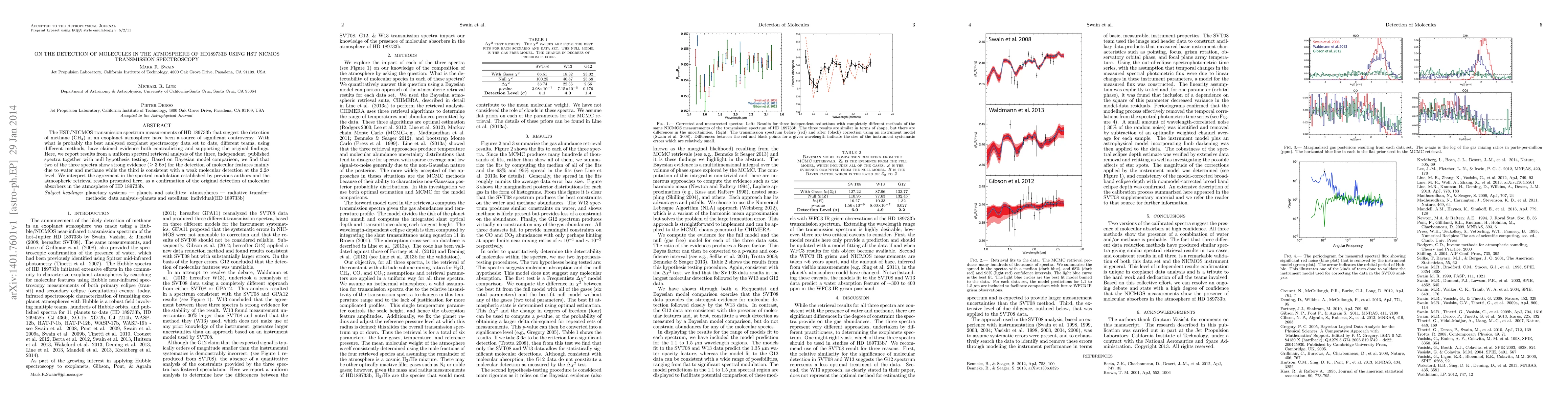 The HST/NICMOS transmission spectrum measurements of HD 189733b that suggest the detection of methane (CH$_{4}$) in an exoplanet atmosphere have been a source of significant controversy. With what is probably the best analyzed exoplanet spectroscopy data set to date, different teams, using different methods, have claimed evidence both contradicting and supporting the original findings. Here, we report results from a uniform spectral retrieval analysis of the three, independent, published spectra together with null hypothesis testing. Based on Bayesian model comparison, we find that two of the three spectra show strong evidence ($\geq$ 3.6$\sigma$) for the detection of molecular features mainly due to water and methane while the third is consistent with a weak molecular detection at the 2.2$\sigma$ level. We interpret the agreement in the spectral modulation established by previous authors and the atmospheric retrieval results presented here, as a confirmation of the original detection of molecular absorbers in the atmosphere of HD 189733b.