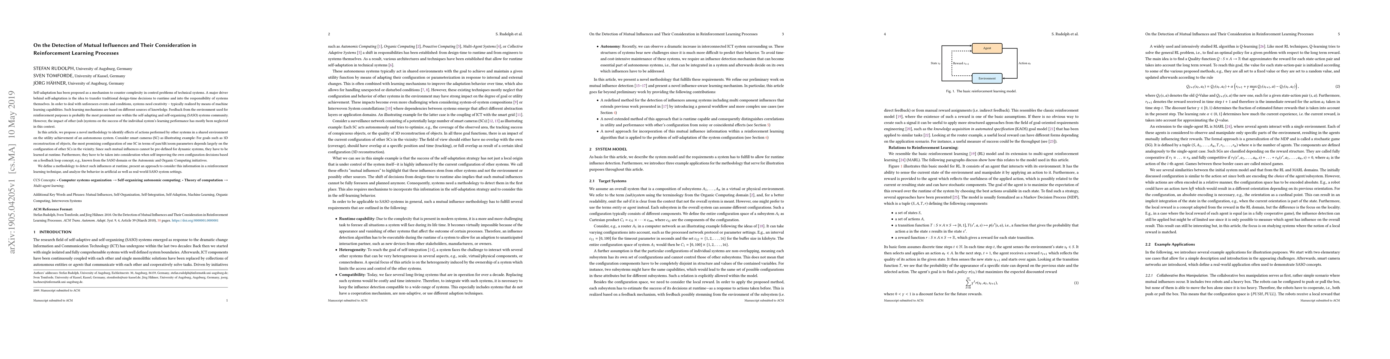 Self-adaptation has been proposed as a mechanism to counter complexity in control problems of technical systems. A major driver behind self-adaptation is the idea to transfer traditional design-time decisions to runtime and into the responsibility of systems themselves. In order to deal with unforeseen events and conditions, systems need creativity -- typically realized by means of machine learning capabilities. Such learning mechanisms are based on different sources of knowledge. Feedback from the environment used for reinforcement purposes is probably the most prominent one within the self-adapting and self-organizing (SASO) systems community. However, the impact of other (sub-)systems on the success of the individual system's learning performance has mostly been neglected in this context. In this article, we propose a novel methodology to identify effects of actions performed by other systems in a shared environment on the utility achievement of an autonomous system. Consider smart cameras (SC) as illustrating example: For goals such as 3D reconstruction of objects, the most promising configuration of one SC in terms of pan/tilt/zoom parameters depends largely on the configuration of other SCs in the vicinity. Since such mutual influences cannot be pre-defined for dynamic systems, they have to be learned at runtime. Furthermore, they have to be taken into consideration when self-improving the own configuration decisions based on a feedback loop concept, e.g., known from the SASO domain or the Autonomic and Organic Computing initiatives. We define a methodology to detect such influences at runtime, present an approach to consider this information in a reinforcement learning technique, and analyze the behavior in artificial as well as real-world SASO system settings.