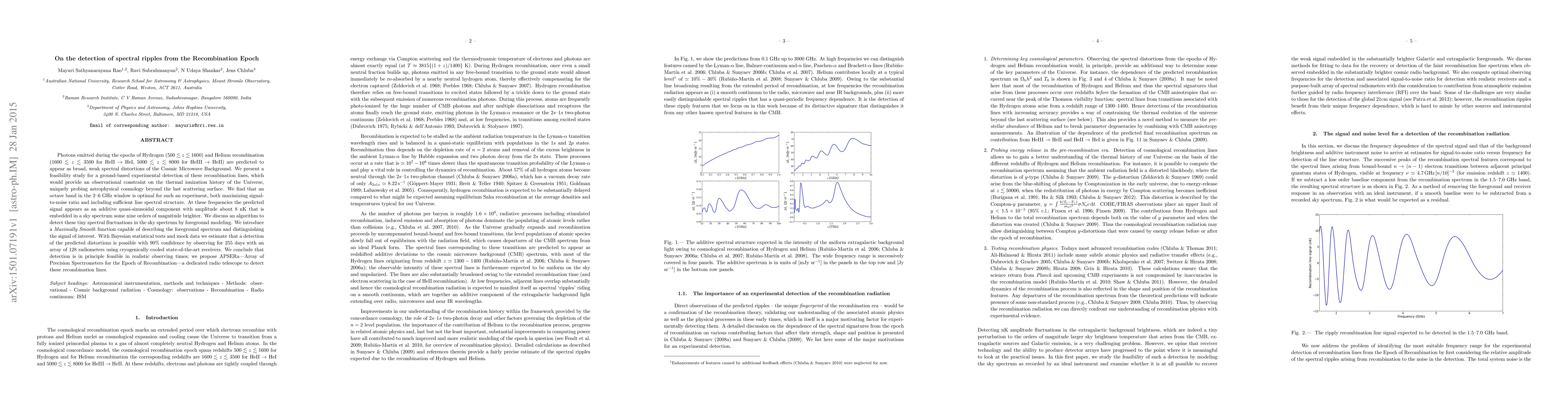 Photons emitted during the epochs of Hydrogen ($500 \lesssim z \lesssim 1600$) and Helium recombination ($1600 \lesssim z \lesssim 3500$ for HeII $\rightarrow$ HeI, $5000 \lesssim z \lesssim 8000$ for HeIII $\rightarrow$ HeII) are predicted to appear as broad, weak spectral distortions of the Cosmic Microwave Background. We present a feasibility study for a ground-based experimental detection of these recombination lines, which would provide an observational constraint on the thermal ionization history of the Universe, uniquely probing astrophysical cosmology beyond the last scattering surface. We find that an octave band in the 2--6 GHz window is optimal for such an experiment, both maximizing signal-to-noise ratio and including sufficient line spectral structure. At these frequencies the predicted signal appears as an additive quasi-sinusoidal component with amplitude about $8$ nK that is embedded in a sky spectrum some nine orders of magnitude brighter. We discuss an algorithm to detect these tiny spectral fluctuations in the sky spectrum by foreground modeling. We introduce a \textit{Maximally Smooth} function capable of describing the foreground spectrum and distinguishing the signal of interest. With Bayesian statistical tests and mock data we estimate that a detection of the predicted distortions is possible with 90\% confidence by observing for 255 days with an array of 128 radiometers using cryogenically cooled state-of-the-art receivers. We conclude that detection is in principle feasible in realistic observing times; we propose APSERa---Array of Precision Spectrometers for the Epoch of Recombination---a dedicated radio telescope to detect these recombination lines.