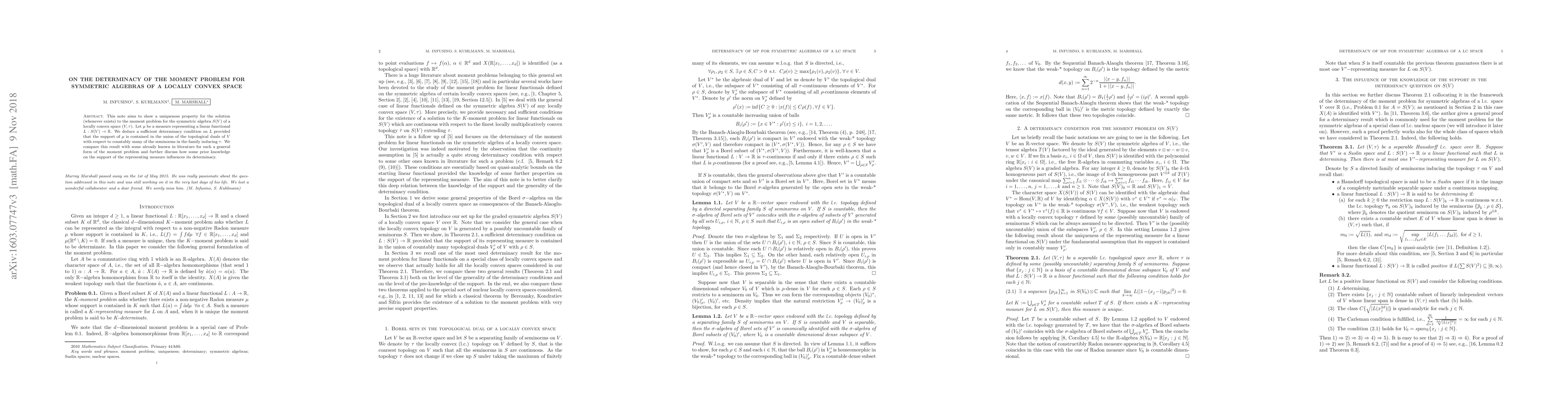 A research paper investigates the uniqueness of solutions to the moment problem for symmetric algebras in locally convex spaces, establishing a sufficient condition based on the support of representing measures.