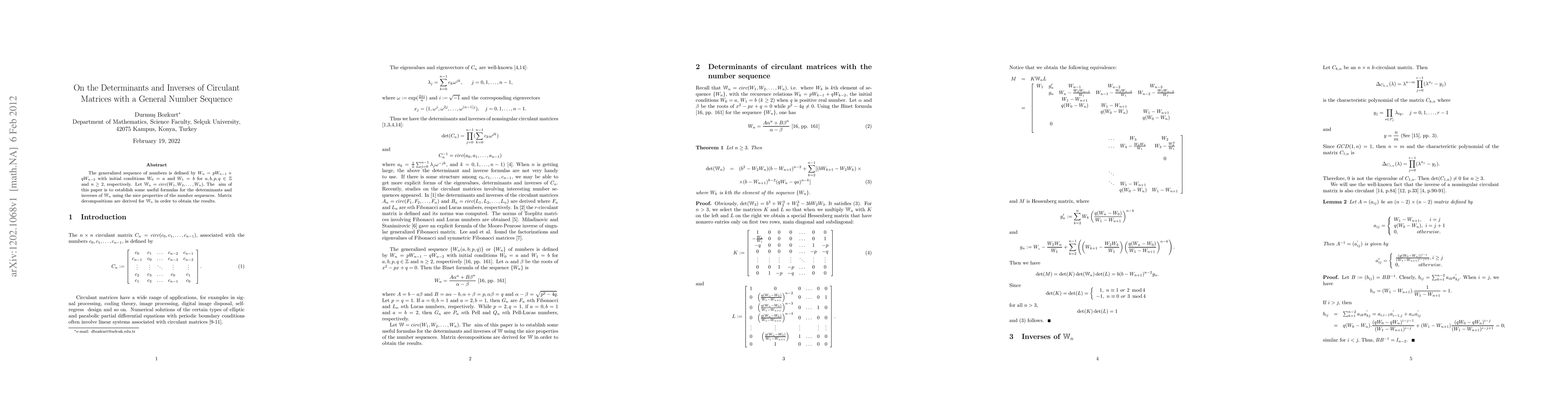 The generalized sequence of numbers is defined by W_{n}=pW_{n-1}+qW_{n-2} with initial conditions W_{0}=a and W_{1}=b for a,b,p,q\inZ and n\geq2, respectively. Let W_{n}=circ(W_{1},W_{2},...,W_{n}). The aim of this paper is to establish some useful formulas for the determinants and inverses of W_{n} using the nice properties of the number sequences. Matrix decompositions are derived for W_{n} in order to obtain the results.
