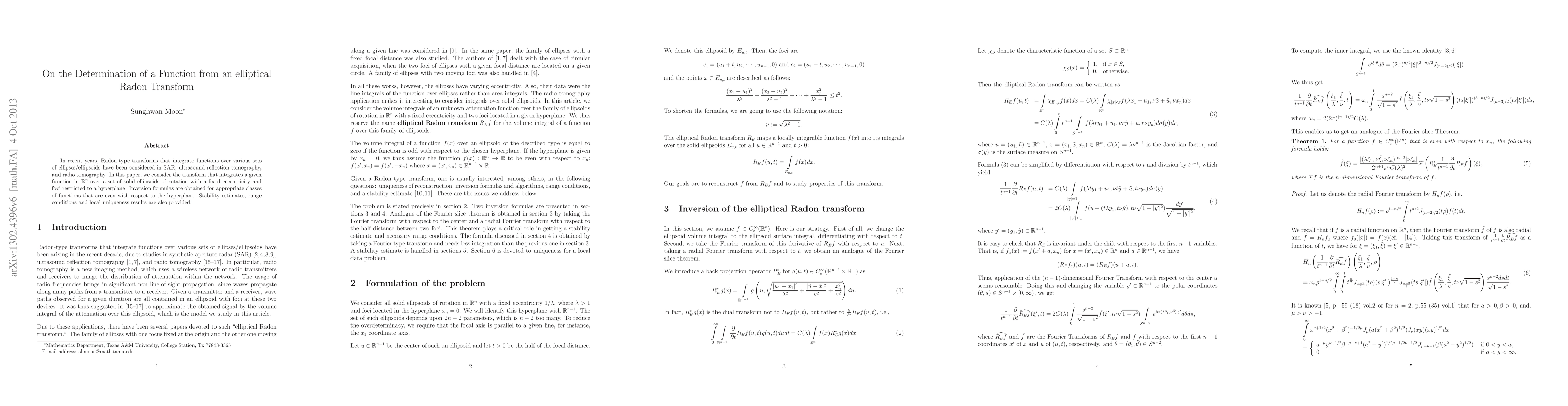 In recent years, Radon type transforms that integrate functions over various sets of ellipses/ellipsoids have been considered in SAR, ultrasound reflection tomography, and radio tomography. In this paper, we consider the transform that integrates a given function in $\RR^n$ over a set of solid ellipsoids of rotation with a fixed eccentricity and foci restricted to a hyperplane. Inversion formulas are obtained for appropriate classes of functions that are even with respect to the hyperplane. Stability estimates, range description, and local uniqueness results are also provided.