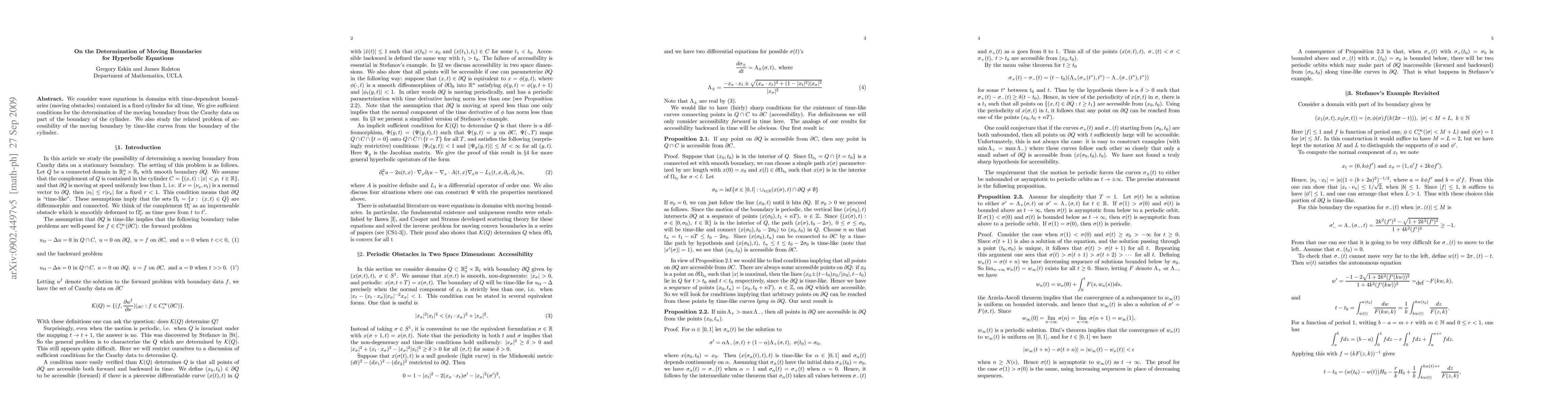 We consider wave equations in domains with time-dependent boundaries (moving obstacles) contained in a fixed cylinder for all time. We give sufficient conditions for the determination of the moving boundary from the Cauchy data on part of the boundary of the cylinder. We also study the related problem of accessibility of the moving boundary by time-like curves from the boundary of the cylinder.