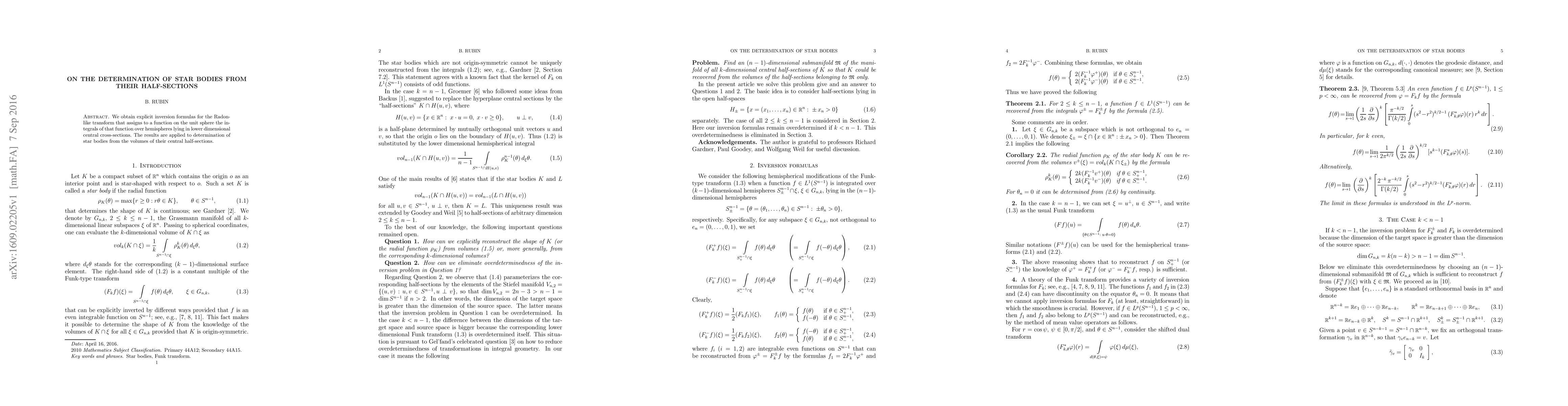 This paper develops explicit formulas for a mathematical transform that assigns function values to star bodies based on their half-section volumes, enabling the determination of star bodies from these volumes.