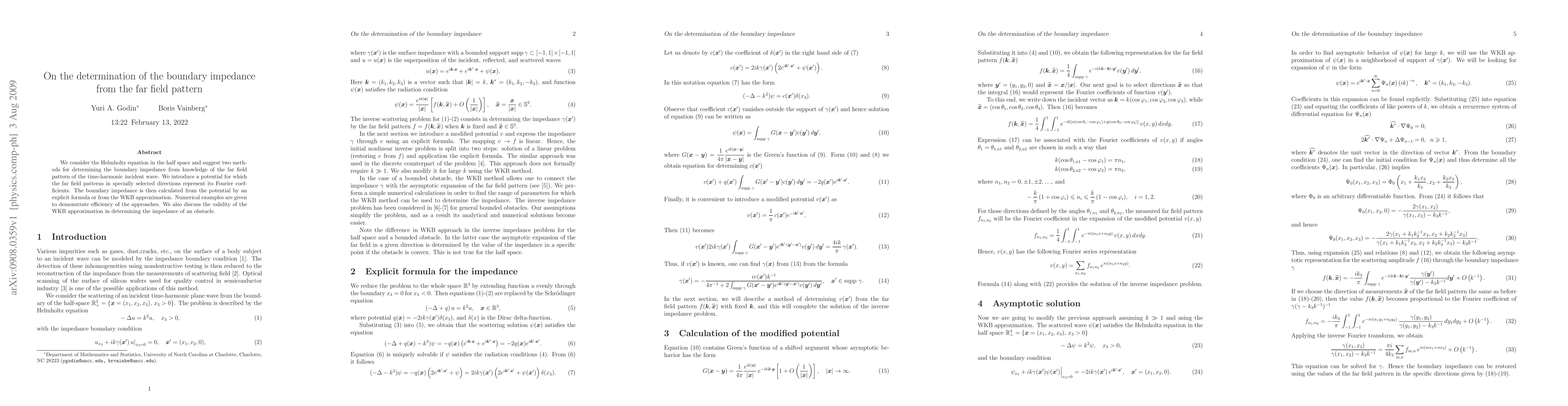 We consider the Helmholtz equation in the half space and suggest two methods for determining the boundary impedance from knowledge of the far field pattern of the time-harmonic incident wave. We introduce a potential for which the far field patterns in specially selected directions represent its Fourier coefficients. The boundary impedance is then calculated from the potential by an explicit formula or from the WKB approximation. Numerical examples are given to demonstrate efficiency of the approaches. We also discuss the validity of the WKB approximation in determining the impedance of an obstacle.