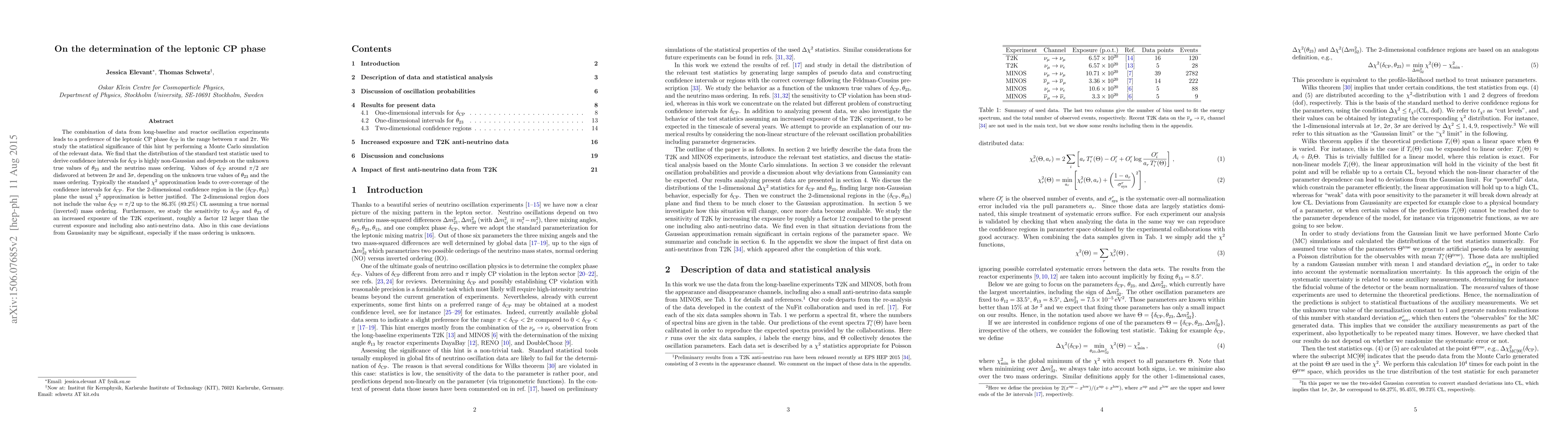 This study investigates the leptonic CP phase (u03c3_{CP}) using long-baseline and reactor oscillation data, finding a preference for u03c3_{CP} in the u03c0 to 2u03c0 range. Monte Carlo simulations reveal non-Gaussian distribution and dependence on unknown u03b8_{23} and mass ordering. Standard u03c4^2 approximation over-covers u03c3_{CP} confidence intervals, while the 2D (u03c3_{CP}, u03b8_{23}) region excludes u03c3_{CP} = u03c0/2 at 86.3% (89.2%) CL for normal (inverted) mass ordering. Increased T2K exposure shows potential for improved sensitivity, though deviations from Gaussianity may persist, especially with unknown mass ordering.