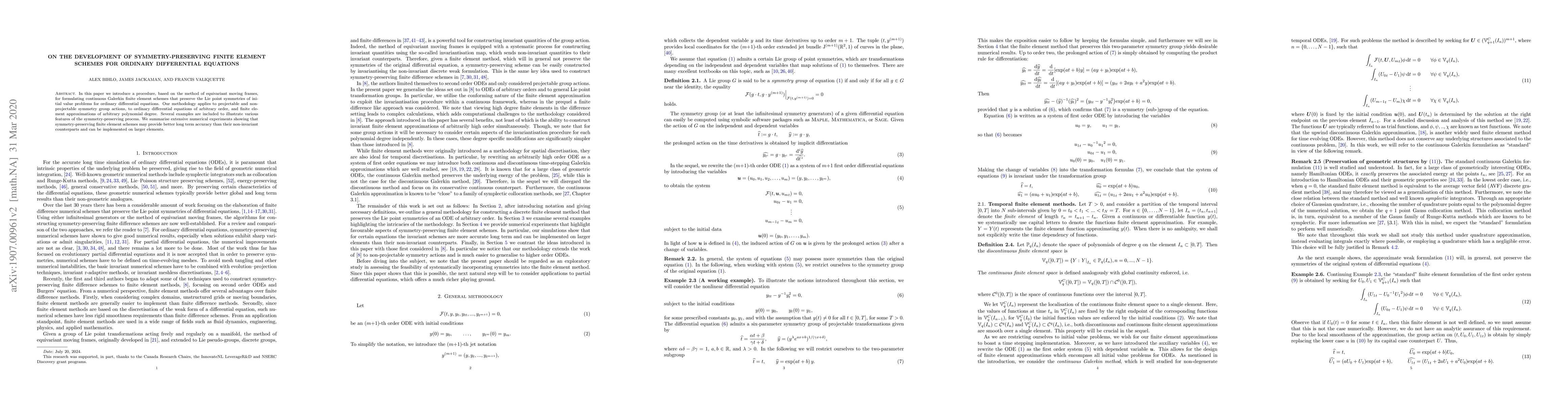 This paper develops a method using equivariant moving frames to create continuous Galerkin finite element schemes that maintain the Lie point symmetries of ordinary differential equations. The approach is shown to be effective for both projectable and non-projectable symmetries, various equation orders, and different polynomial degrees, with numerical experiments indicating improved long-term accuracy and flexibility in element size.