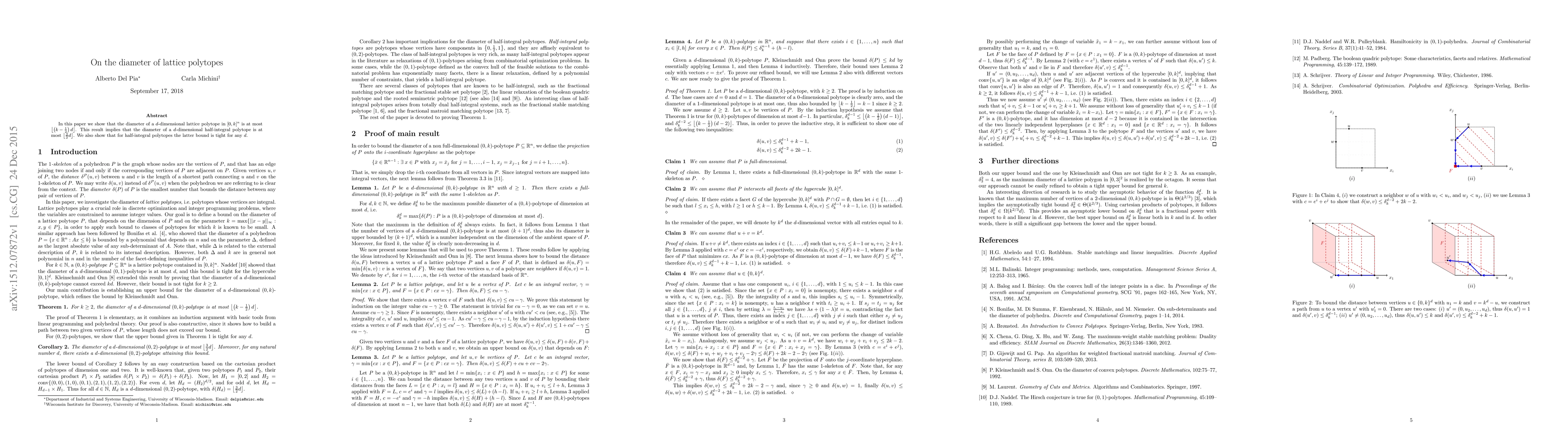 This paper establishes an upper bound for the diameter of d-dimensional lattice polytopes within [0,k]^n, proving it to be at most (k - 1/2) d, and demonstrates that the diameter of d-dimensional half-integral polytopes is at most 3/2 d, with this bound being tight for any d.