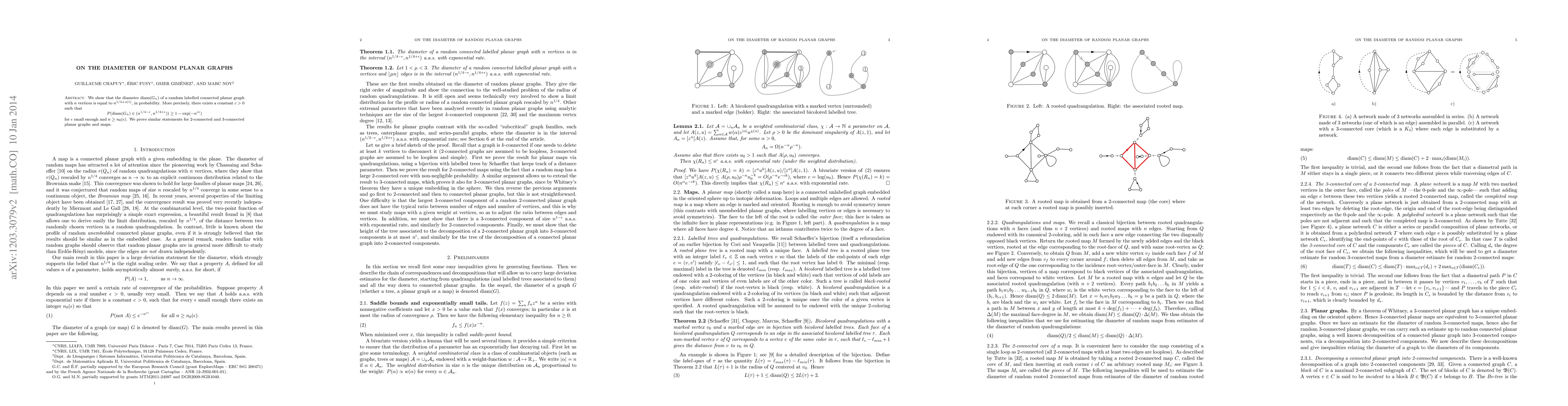 The paper demonstrates that the diameter of a random labelled connected planar graph with n vertices is approximately n^(1/4+o(1)), with high probability. It also extends this result to 2-connected and 3-connected planar graphs and maps.