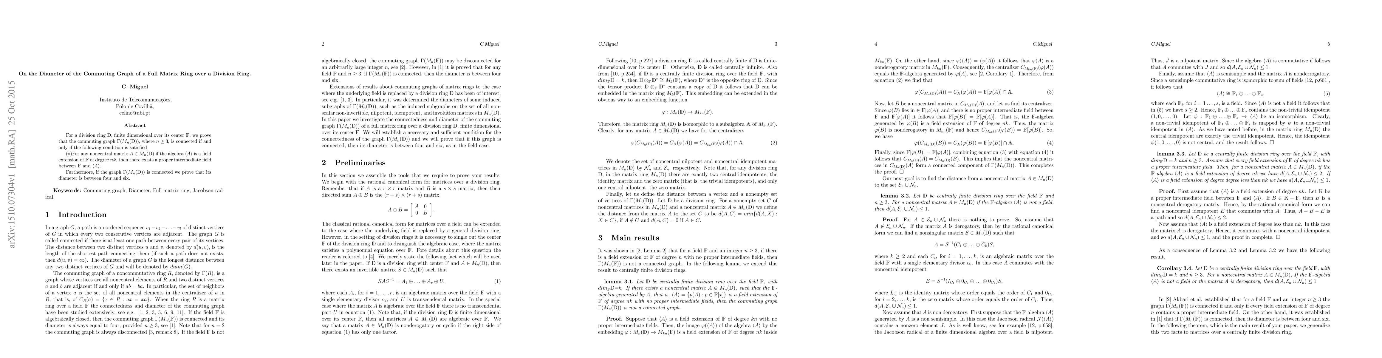 For a division ring D, finite dimensional over its center F, we give a condiction for the connectedness of the commuting graph of a matrix ring over $D$. Furthermore, we prove that if the commuting graph is connected, then its diameter is between four and six.