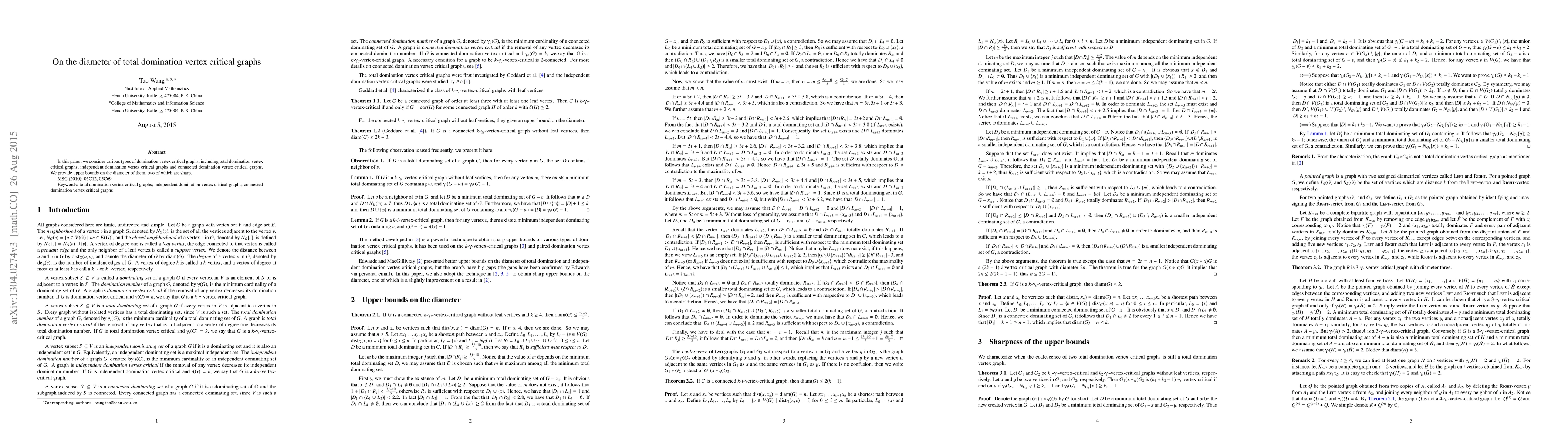 This paper investigates the diameter of different types of vertex critical graphs, focusing on total domination vertex critical graphs, and provides sharp upper bounds for their diameters.