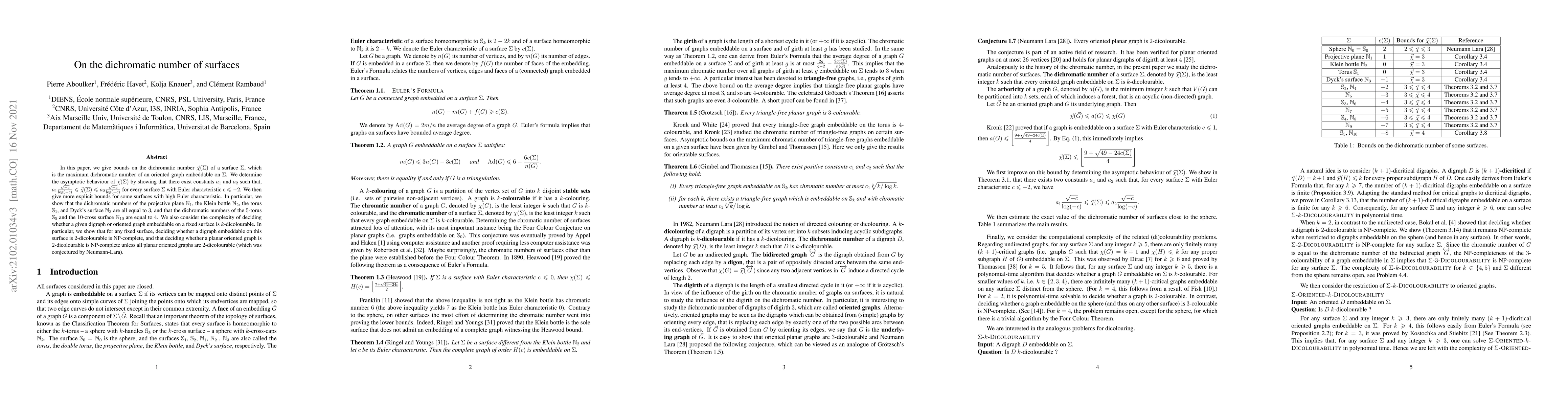 This paper provides bounds on the dichromatic number of surfaces, showing that for surfaces with Euler characteristic $c \leq -2$, $\vec{\chi}(\Sigma)$ is asymptotically proportional to $\frac{\sqrt{-c}}{\log(-c)}$. It also determines specific dichromatic numbers for various surfaces and proves the NP-completeness of deciding $2$-dichromaticity for certain classes of oriented graphs.