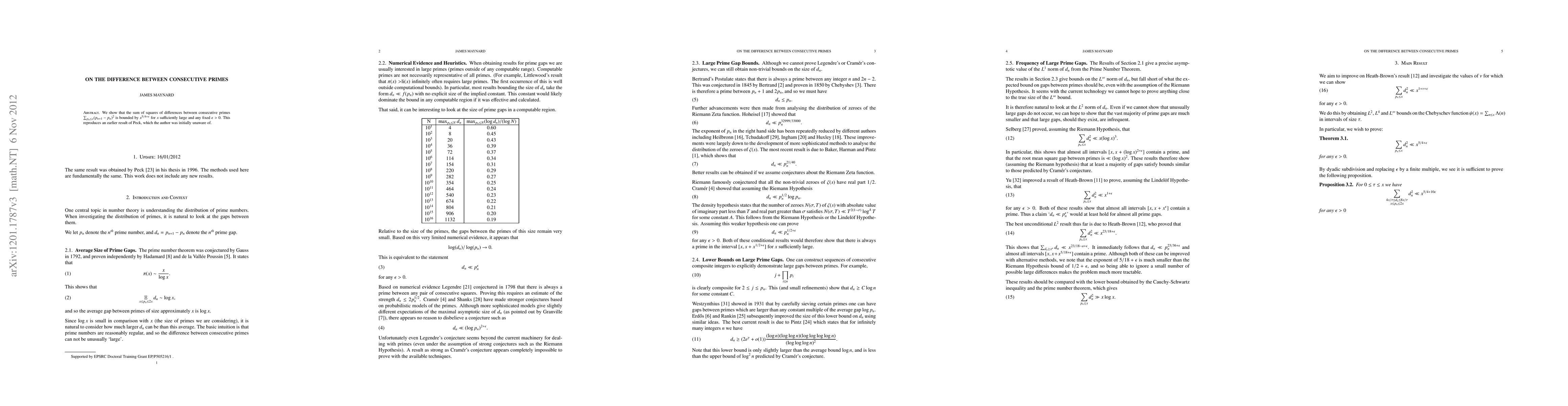 This work reproduces an earlier result of Peck, confirming the bound on the sum of squares of differences between consecutive primes, which has implications for understanding the distribution of prime numbers.