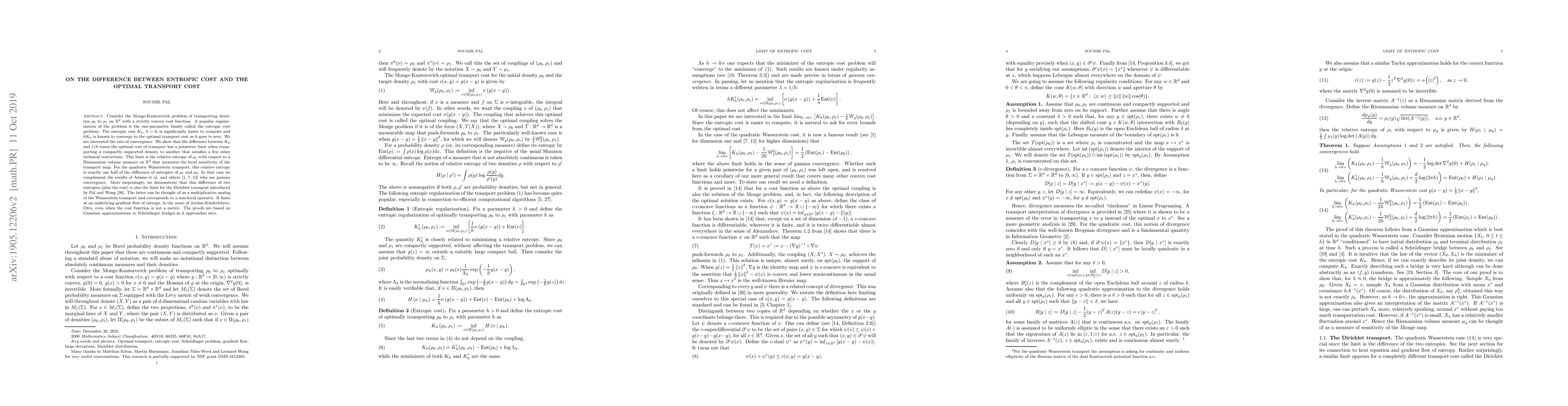 Researchers investigate the difference between entropic cost and optimal transport cost in a Monge-Kantorovich problem, showing that this difference converges to the relative entropy of densities as a parameter h approaches zero.