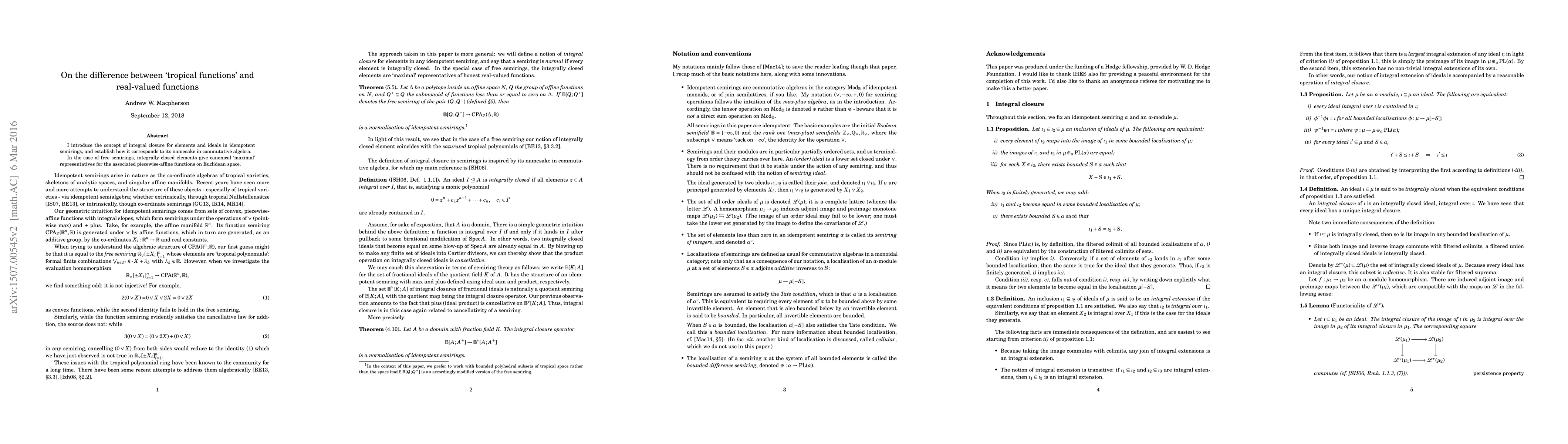 I introduce the concept of integral closure for elements and ideals in idempotent semirings, and establish how it corresponds to its namesake in commutative algebra. In the case of free semirings, integral closure can be understood in terms of a certain monoid of convex bodies under Minkowski sum. I argue that integral closure therefore accounts for the difference between `tropical functions' and real functions.