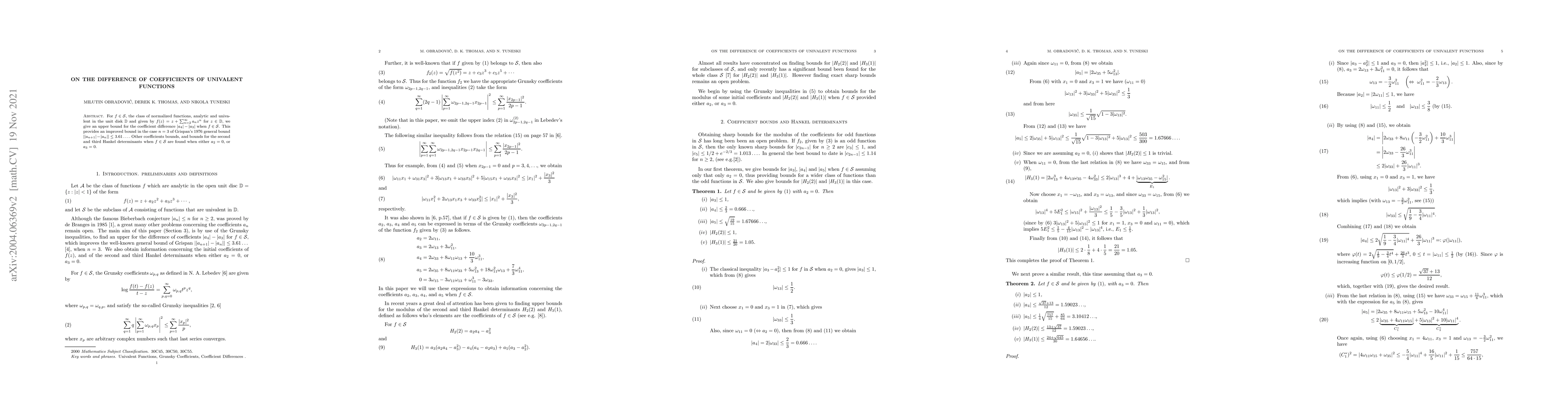 For $f\in \mathcal{S}$, the class of normalized functions, analytic and univalent in the unit disk $\mathbb{D}$ and given by $f(z)=z+\sum_{n=2}^{\infty} a_n z^n$ for $z\in \mathbb{D}$, we give an upper bound for the coefficient difference $|a_4|-|a_3|$ when $f\in \mathcal{S}$. This provides an improved bound in the case $n=3$ of Grispan's 1976 general bound $||a_{n+1}|-|a_n||\le 3.61\dots .$ Other coefficients bounds, and bounds for the second and third Hankel determinants when $f\in \mathcal{S}$ are found when either $a_2=0,$ or $a_3=0$.