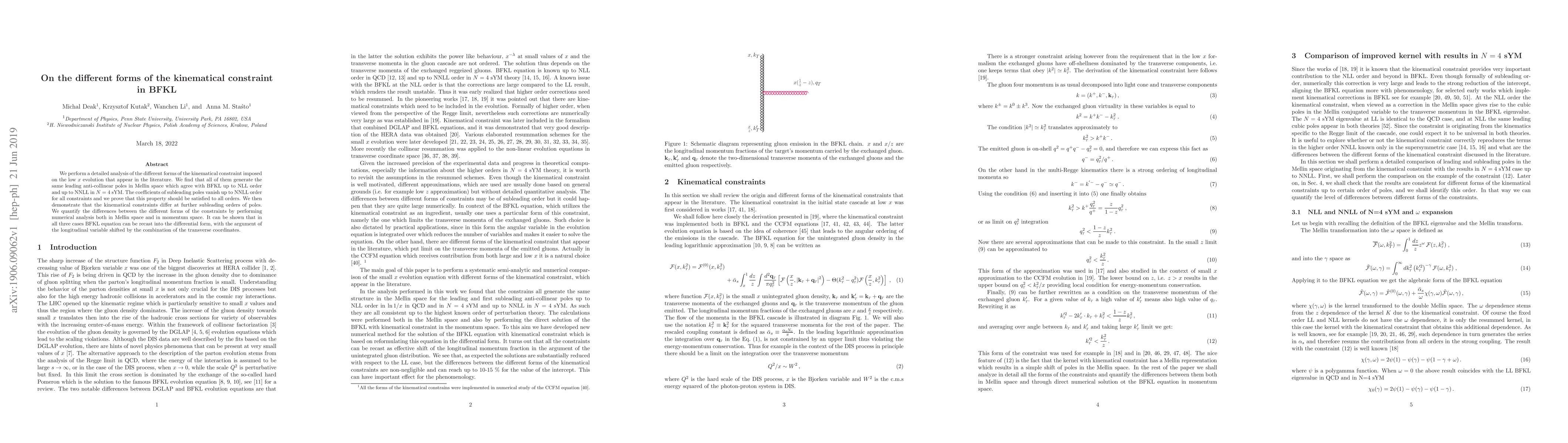 A research paper analyzes different forms of kinematical constraints in low $x$ evolution, finding they all produce the same leading poles as BFKL up to NNLL order, but differ at further subleading orders.