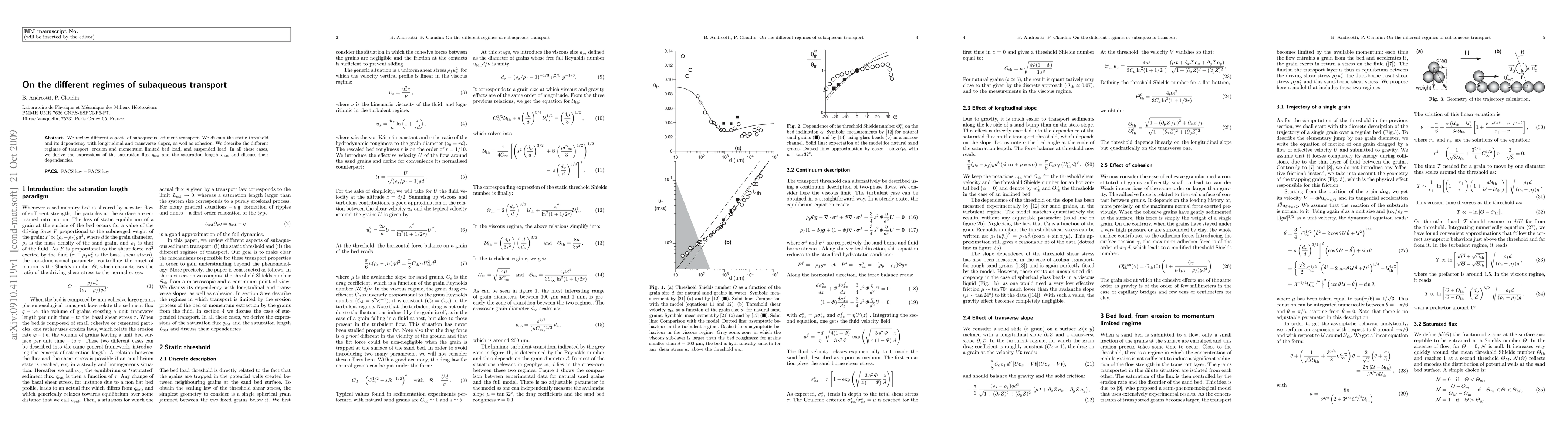 This paper reviews subaqueous sediment transport regimes, including erosion and momentum-limited bed load, suspended load, and derives expressions for saturation flux and length, focusing on their dependencies with slope and cohesion.