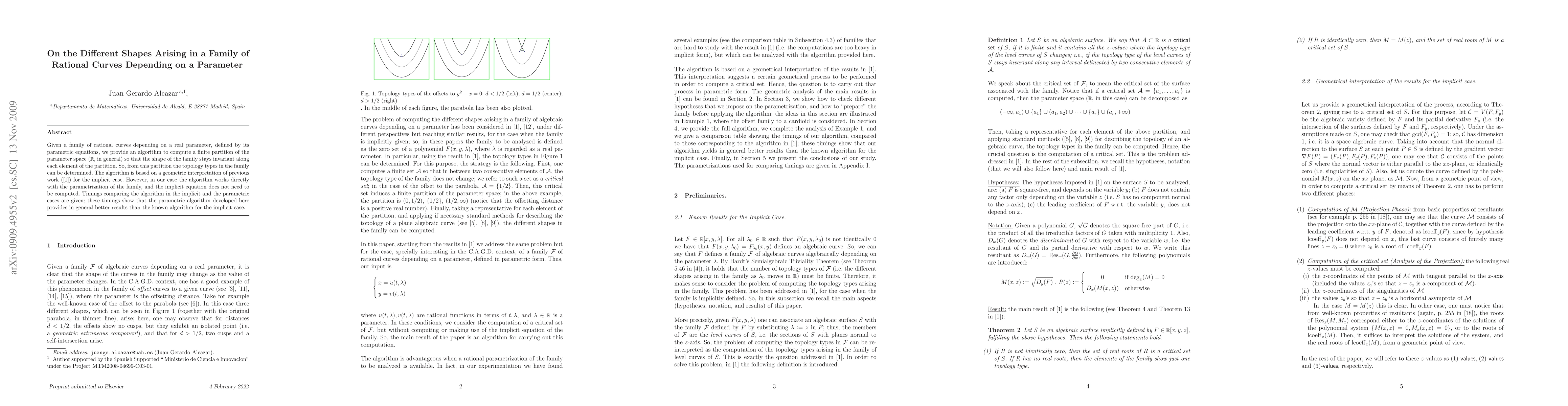 Given a family of rational curves depending on a real parameter, defined by its parametric equations, we provide an algorithm to compute a finite partition of the parameter space (${\Bbb R}$, in general) so that the shape of the family stays invariant along each element of the partition. So, from this partition the topology types in the family can be determined. The algorithm is based on a geometric interpretation of previous work (\cite{JGRS}) for the implicit case. However, in our case the algorithm works directly with the parametrization of the family, and the implicit equation does not need to be computed. Timings comparing the algorithm in the implicit and the parametric cases are given; these timings show that the parametric algorithm developed here provides in general better results than the known algorithm for the implicit case.
