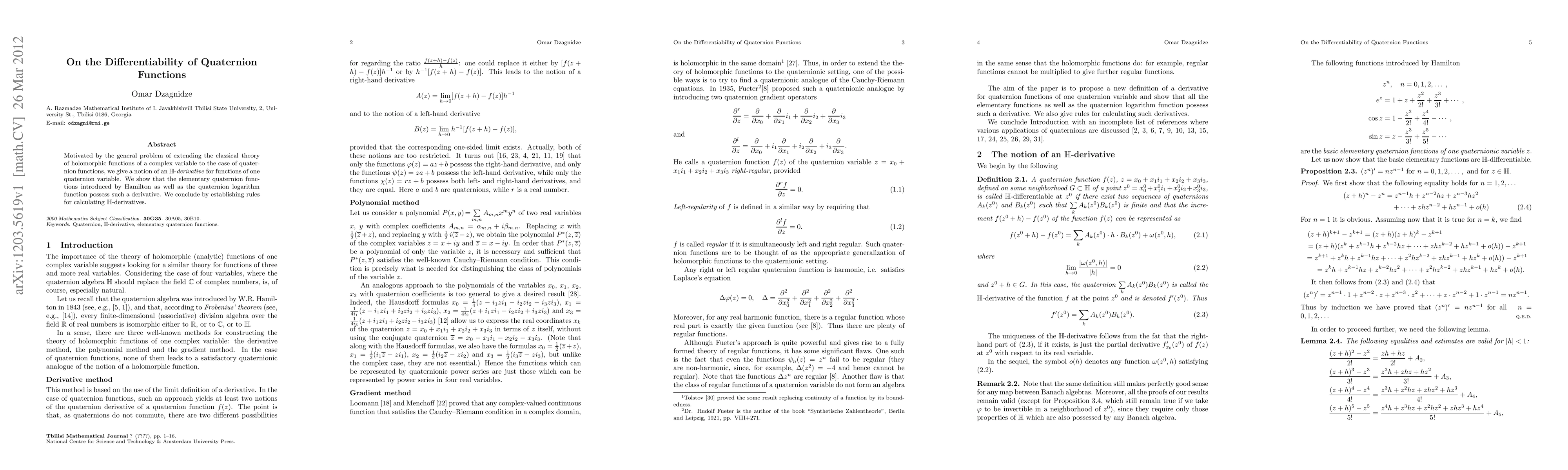 This paper introduces the concept of an H-derivative for quaternion functions, extending the classical theory of holomorphic functions to quaternions. It demonstrates that fundamental quaternion functions, including those introduced by Hamilton, have H-derivatives and provides rules for their calculation.