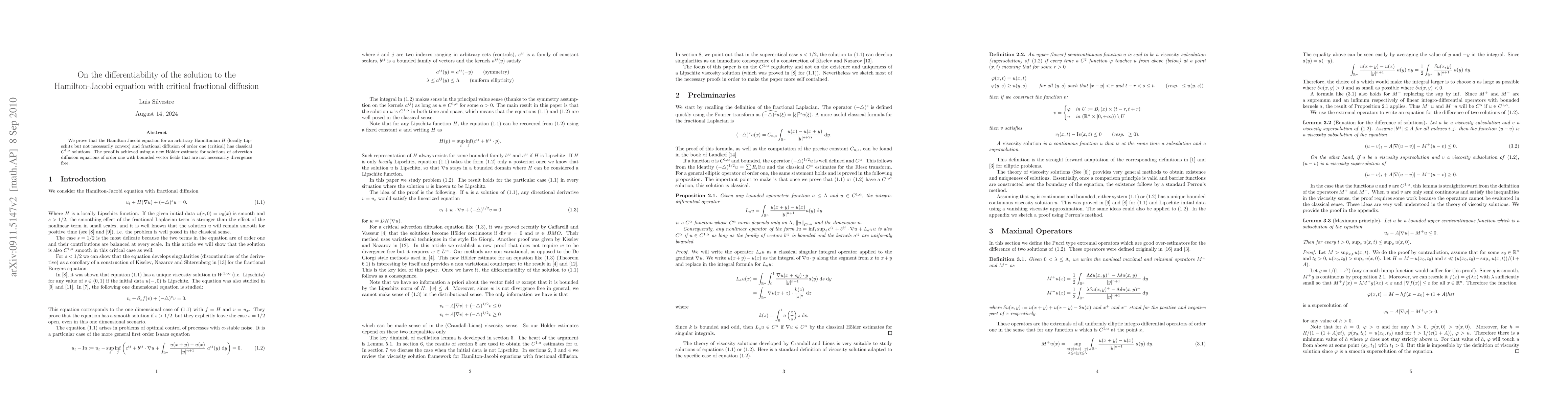 We prove that the Hamilton Jacobi equation for an arbitrary Hamiltonian $H$ (locally Lipschitz but not necessarily convex) and fractional diffusion of order one (critical) has classical $C^{1,\alpha}$ solutions. The proof is achieved using a new H\"older estimate for solutions of advection diffusion equations of order one with bounded vector fields that are not necessarily divergence free.
