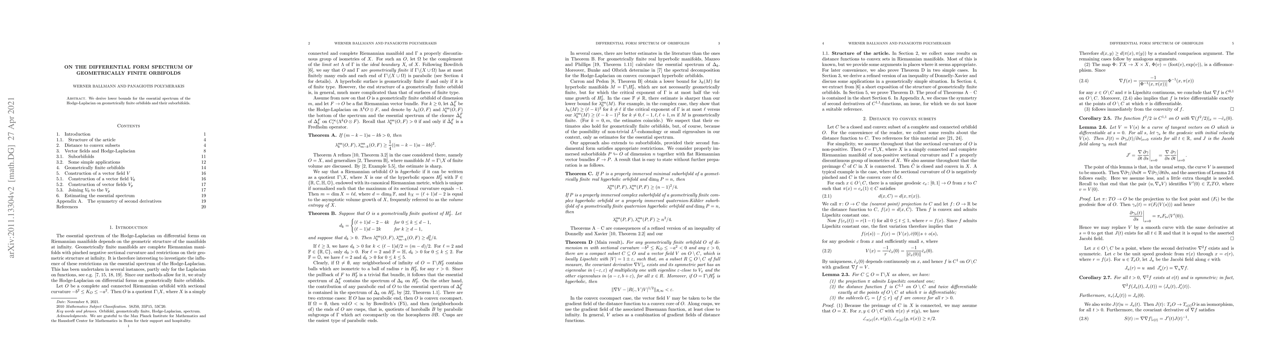 Summary: This paper establishes lower bounds for the essential spectrum of the Hodge-Laplacian on geometrically finite orbifolds and their suborbifolds, contributing to the understanding of their differential form spectrum. The results provide insights into the geometric and topological properties of these complex structures.