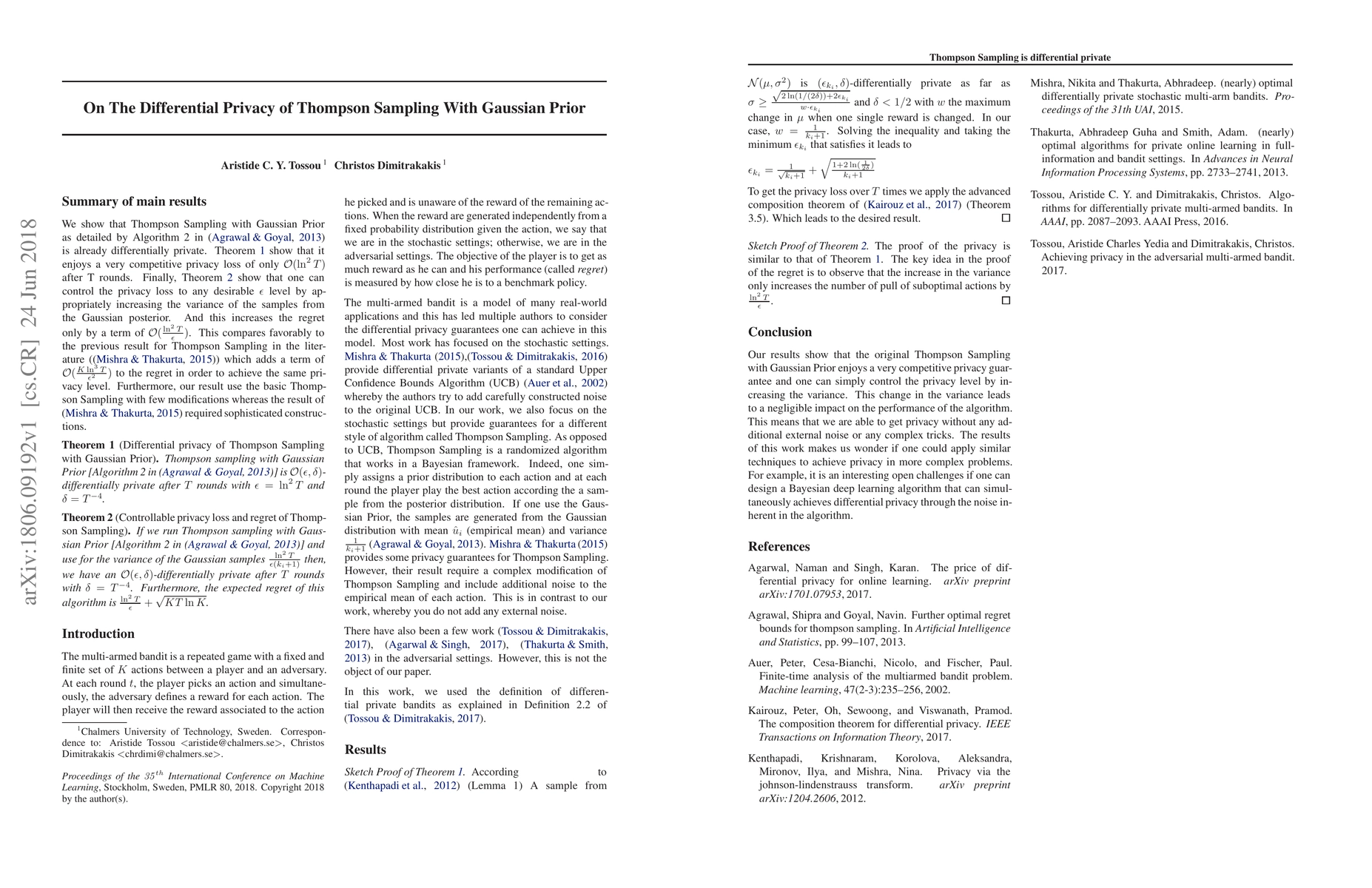 This paper demonstrates that Thompson Sampling with Gaussian Prior is inherently differentially private, achieving a privacy loss of $\mathcal{O}(\ln^2 T)$ after T rounds. It also shows that privacy loss can be adjusted to any $\epsilon$ level by modifying the Gaussian posterior variance, increasing regret only by $\mathcal{O}(\frac{\ln^2 T}{\epsilon})$, outperforming previous results.
