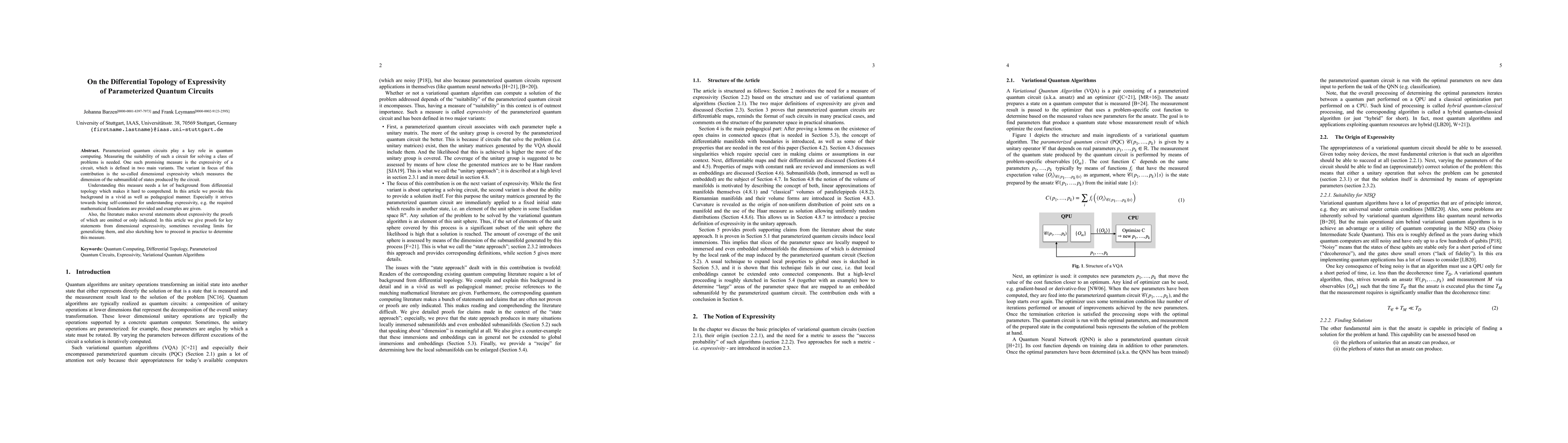 The paper provides a comprehensive background in differential topology, focusing on the expressivity of parameterized quantum circuits, defined as dimensional expressivity, which measures the dimension of the submanifold of states produced by the circuit.