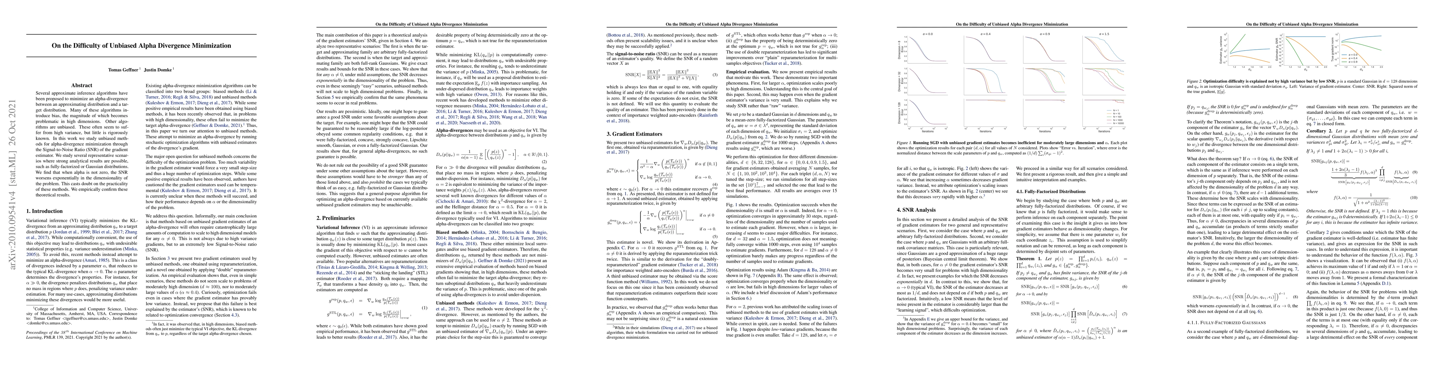 This paper investigates unbiased methods for minimizing alpha-divergence, finding that their Signal-to-Noise Ratio (SNR) deteriorates exponentially with dimensionality when alpha is non-zero, casting doubt on their practical viability. Empirical results corroborate these theoretical findings.