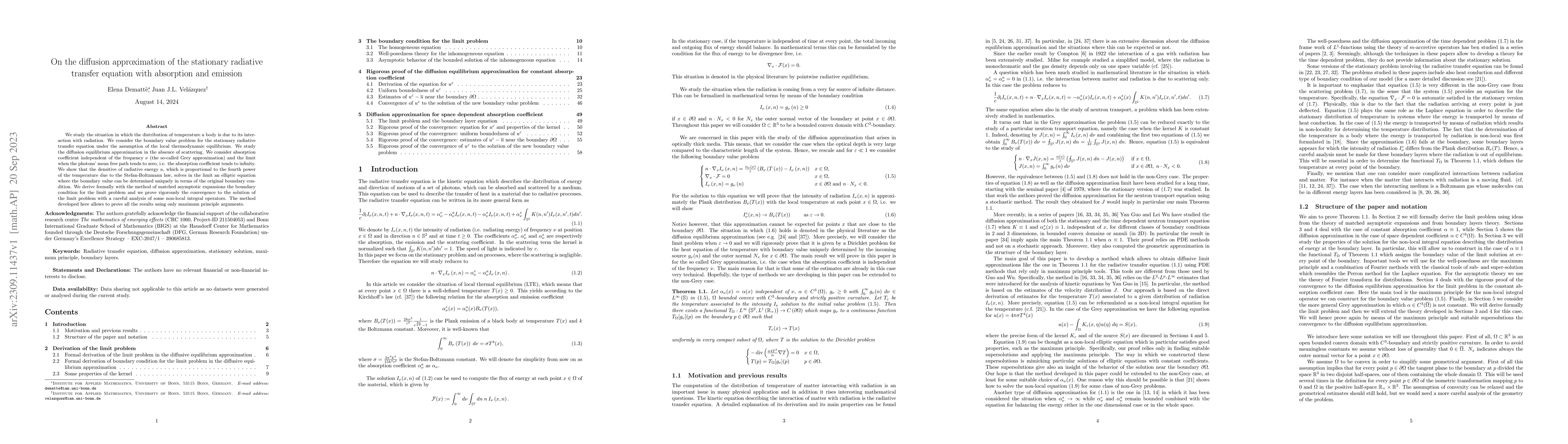 We study the situation in which the distribution of temperature a body is due to its interaction with radiation. We consider the boundary value problem for the stationary radiative transfer equation under the assumption of the local thermodynamic equilibrium. We study the diffusion equilibrium approximation in the absence of scattering. We consider absorption coefficient independent of the frequency $ \nu $ (the so-called Grey approximation) and the limit when the photons' mean free path tends to zero, i.e. the absorption coefficient tends to infinity. We show that the densitive of radiative energy $ u $, which is proportional to the fourth power of the temperature due to the Stefan-Boltzmann law, solves in the limit an elliptic equation where the boundary value can be determined uniquely in terms of the original boundary condition. We derive formally with the method of matched asymptotic expansions the boundary condition for the limit problem and we prove rigorously the convergence to the solution of the limit problem with a careful analysis of some non-local integral operators. The method developed here allows to prove all the results using only maximum principle arguments.
