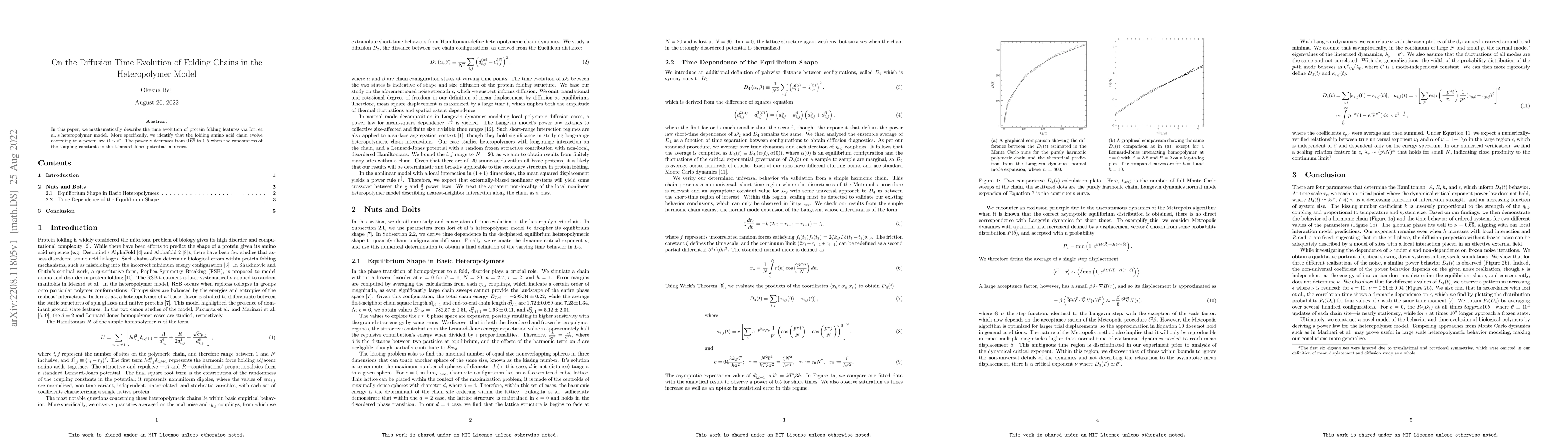 This paper mathematically models the diffusion time evolution of folding in protein chains using Iori et al.'s heteropolymer model, revealing a power law $D \sim t^{\nu}$ where $\nu$ decreases from $0.\overline{66}$ to $0.5$ with increased randomness in Lennard-Jones potential coupling constants.