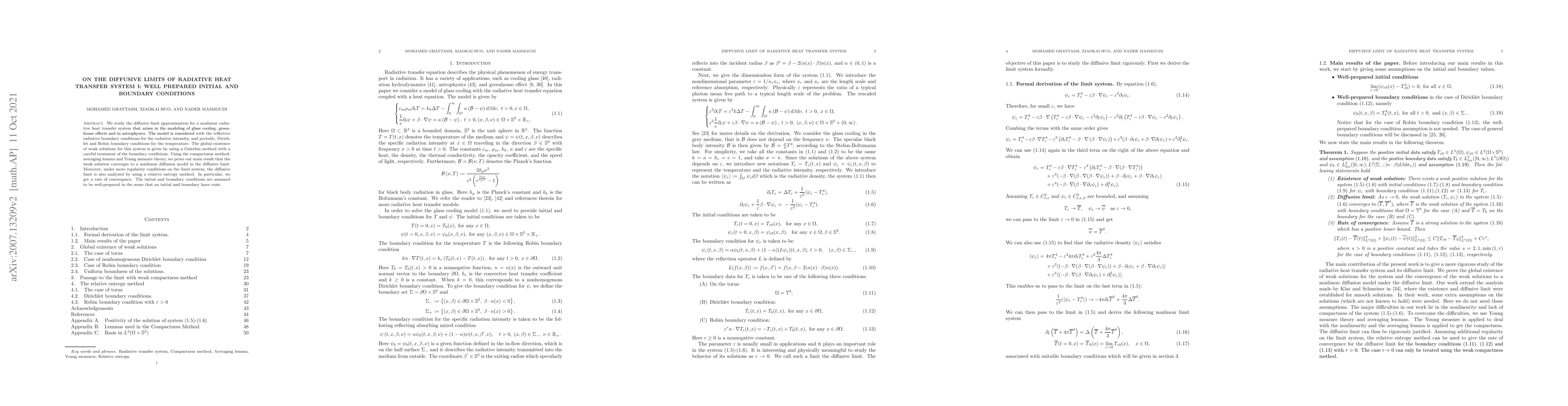 This paper investigates the diffusive limit approximation for a nonlinear radiative heat transfer system, focusing on glass cooling, greenhouse effects, and astrophysics. The study proves the convergence of weak solutions to a nonlinear diffusion model under well-prepared initial and boundary conditions, with a rate of convergence derived using relative entropy methods.
