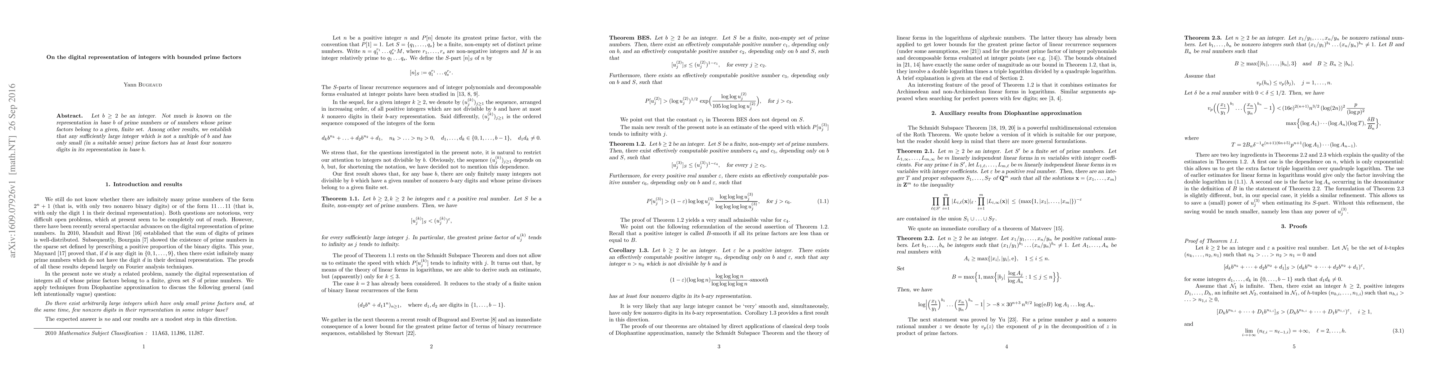 Let $b \ge 2$ be an integer. Not much is known on the representation in base $b$ of prime numbers or of numbers whose prime factors belong to a given, finite set. Among other results, we establish that any sufficiently large integer which is not a multiple of $b$ and has only small (in a suitable sense) prime factors has at least four nonzero digits in its representation in base $b$.