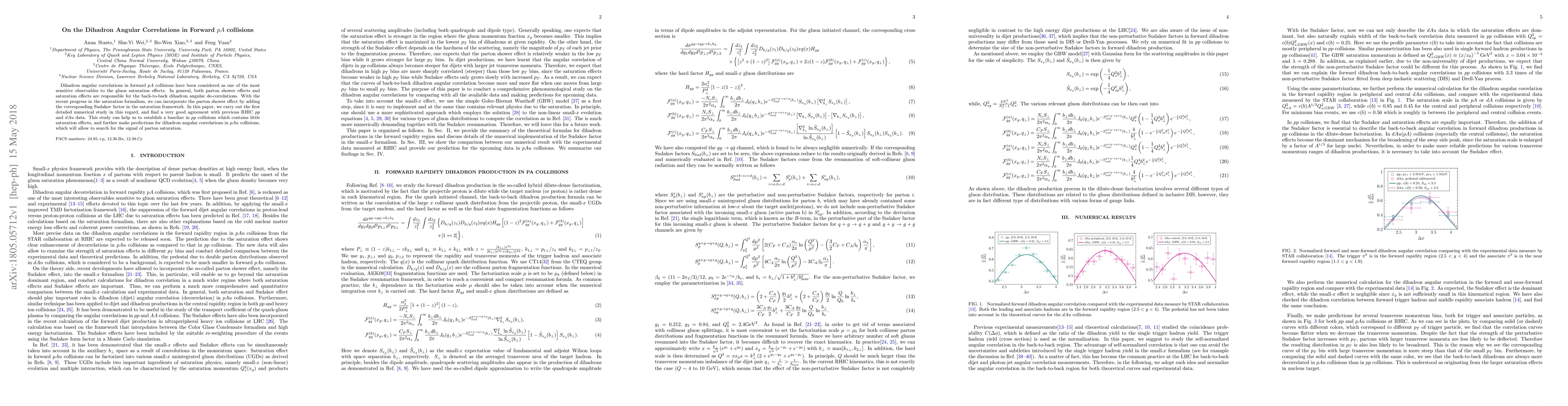 This paper investigates dihadron angular correlations in forward $pA$ collisions to study gluon saturation effects, incorporating parton shower effects through a Sudakov factor in the saturation framework. The study finds good agreement with previous RHIC data, providing a baseline for $pp$ collisions and predictions for $pAu$ collisions to search for parton saturation signals.
