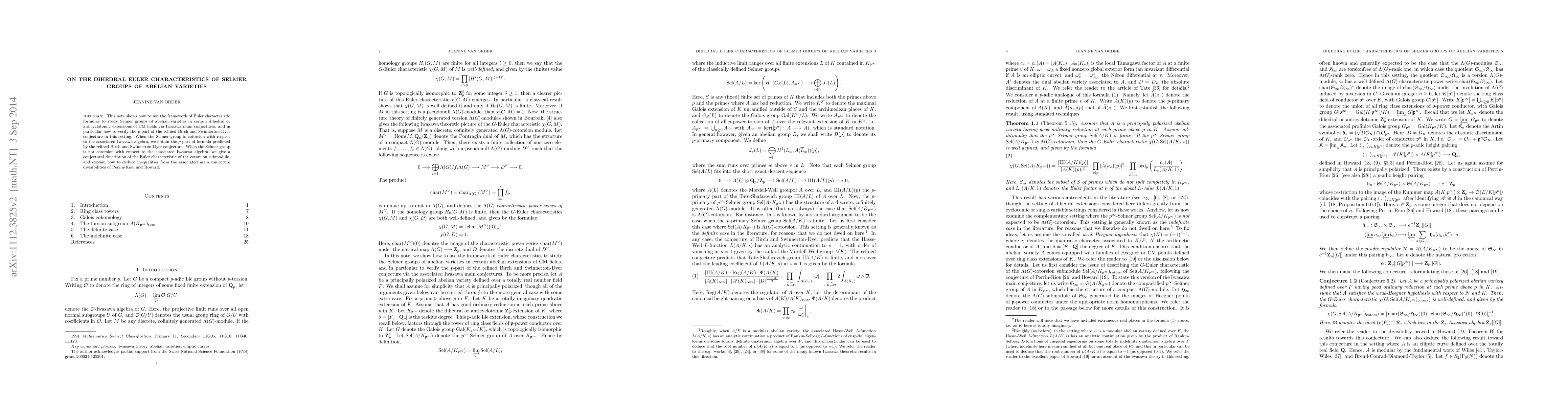 This paper utilizes Euler characteristic formulae and Iwasawa main conjectures to investigate Selmer groups of abelian varieties in dihedral or anticyclotomic extensions of CM fields, aiming to verify the p-part of the refined Birch and Swinnerton-Dyer conjecture, with specific results on cotorsion Selmer groups and conjectural descriptions for non-cotorsion cases.