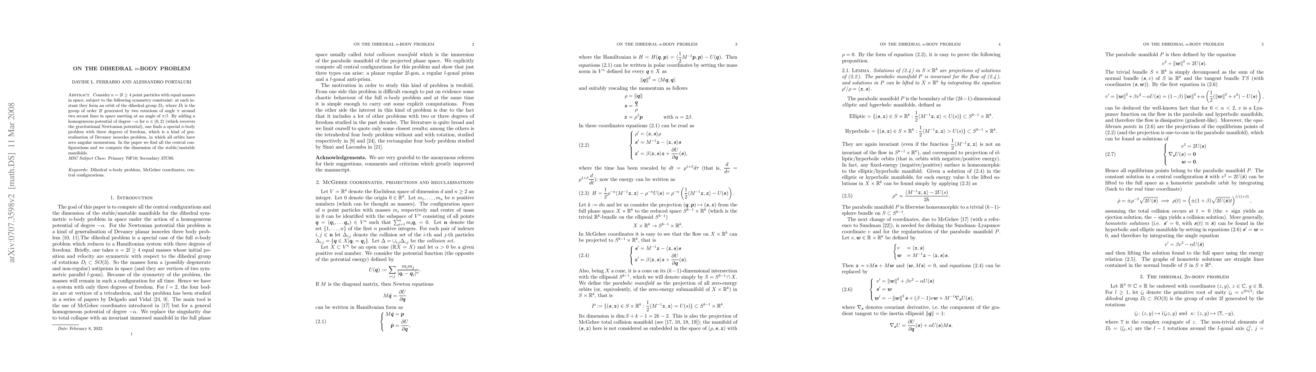 Consider n=2l>=4 point particles with equal masses in space, subject to the following symmetry constraint: at each instant they form an orbit of the dihedral group D_l, where D_l is the group of order 2l generated by two rotations of angle pi around two secant lines in space meeting at an angle of pi/l. By adding a homogeneous gravitational (Newtonian) potential one finds a special $n$-body problem with three degrees of freedom, which is a kind of generalisation of Devaney isosceles problem, in which all orbits have zero angular momentum. In the paper we find all the central configurations and we compute the dimension of the stable/unstable manifolds.