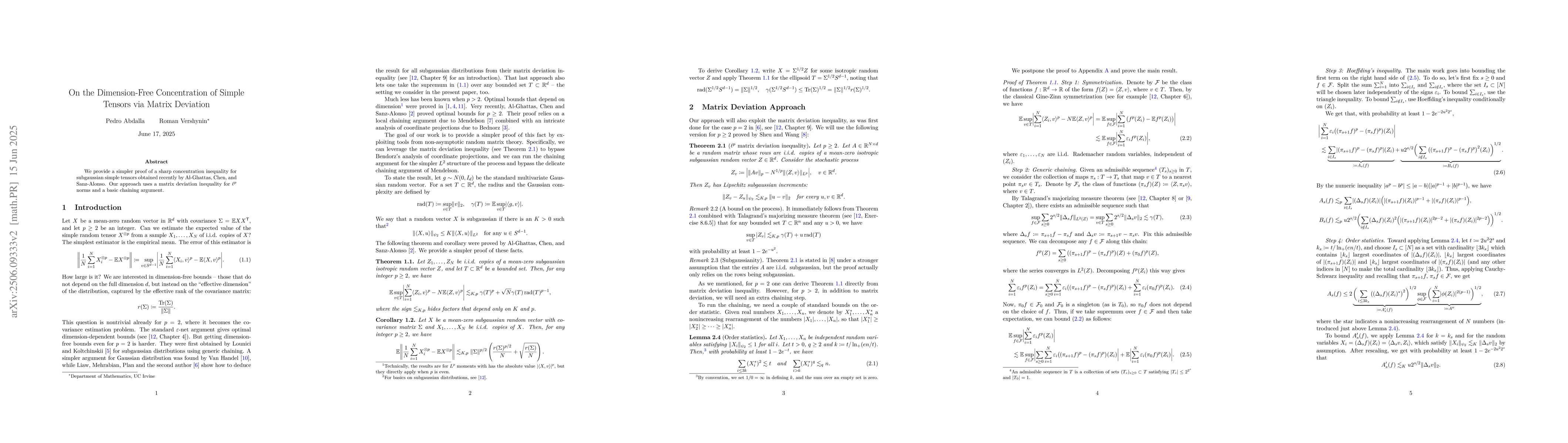 We provide a simpler proof of a sharp concentration inequality for subgaussian simple tensors obtained recently by Ghattas, Chen, and Alonso. Our approach uses a matrix deviation inequality for $\ell^p$ norms and a basic chaining argument.