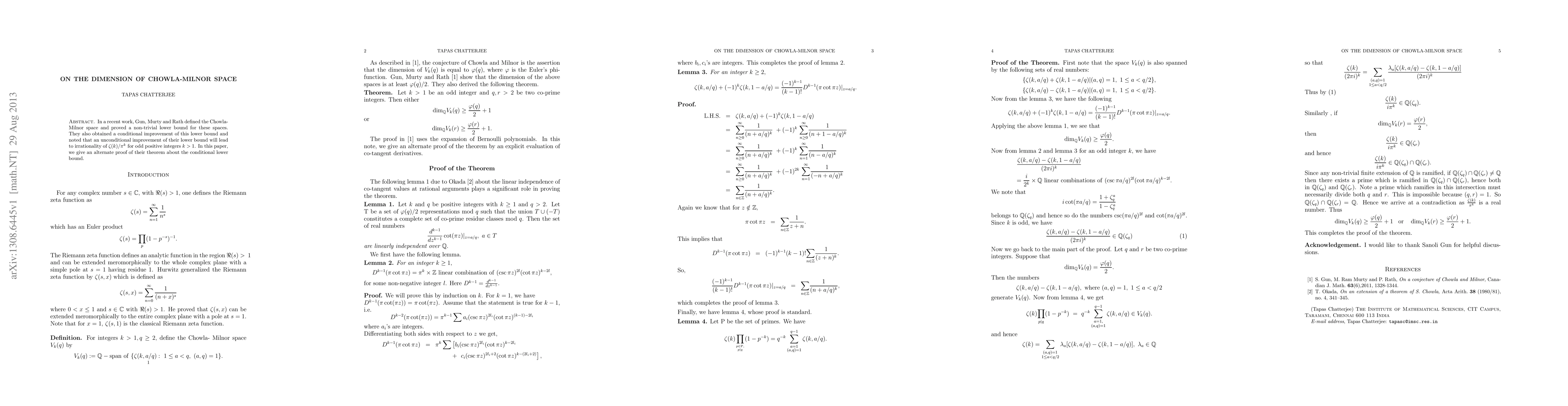 Researchers provide an alternate proof of a theorem about the dimension of Chowla-Milnor space, improving a conditional lower bound for these spaces, which could lead to irrationality of certain mathematical constants.