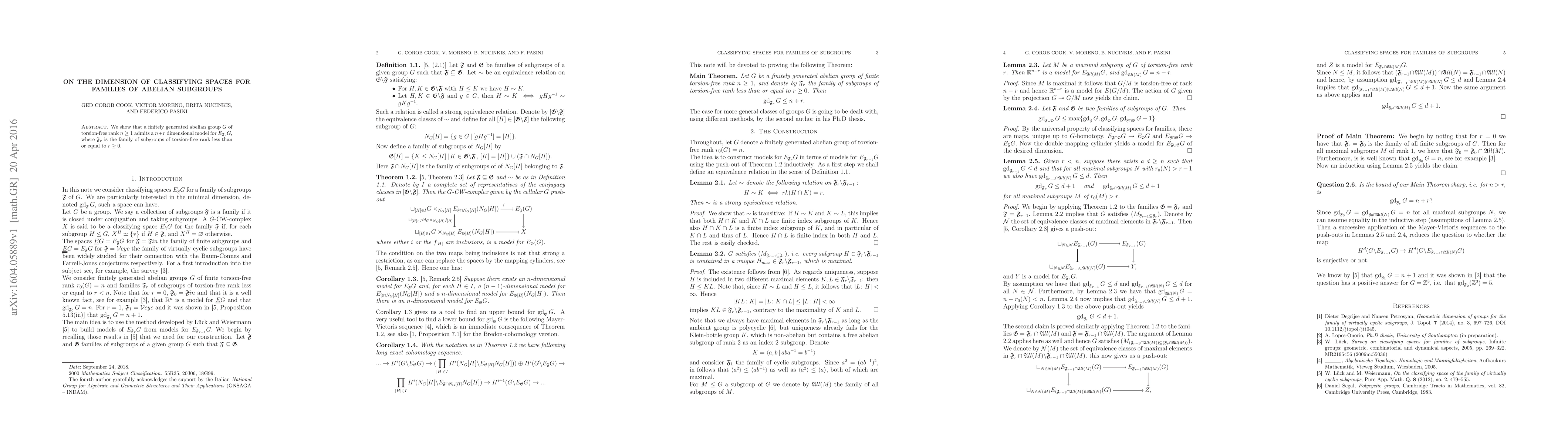 The paper establishes that a finitely generated abelian group $G$ with torsion-free rank $n$ can be modeled by a $(n+r)$-dimensional classifying space when considering subgroups with torsion-free rank $\leq r$. This provides a dimensional upper bound for classifying spaces based on subgroup structures.
