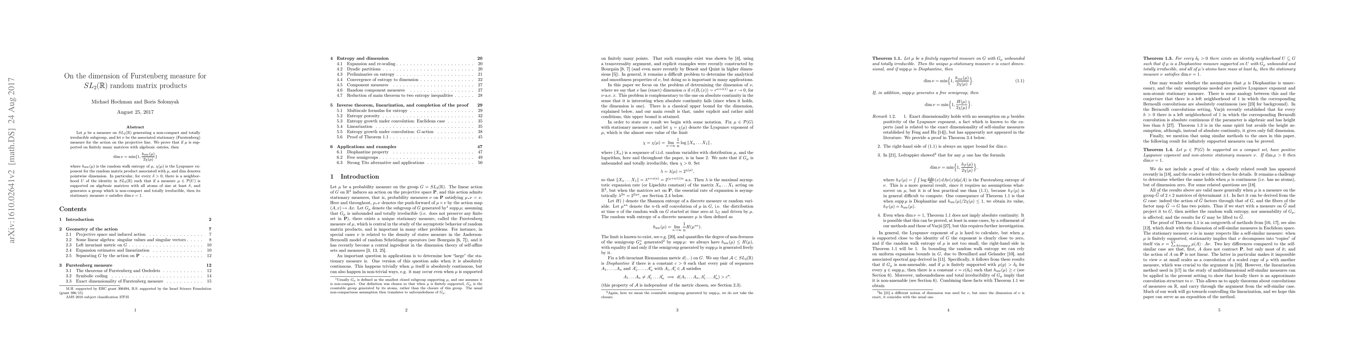 This paper studies the dimension of a stationary measure for actions on the projective line by random matrix products, finding that it is bounded by a function of the Lyapunov exponent and the random walk entropy.