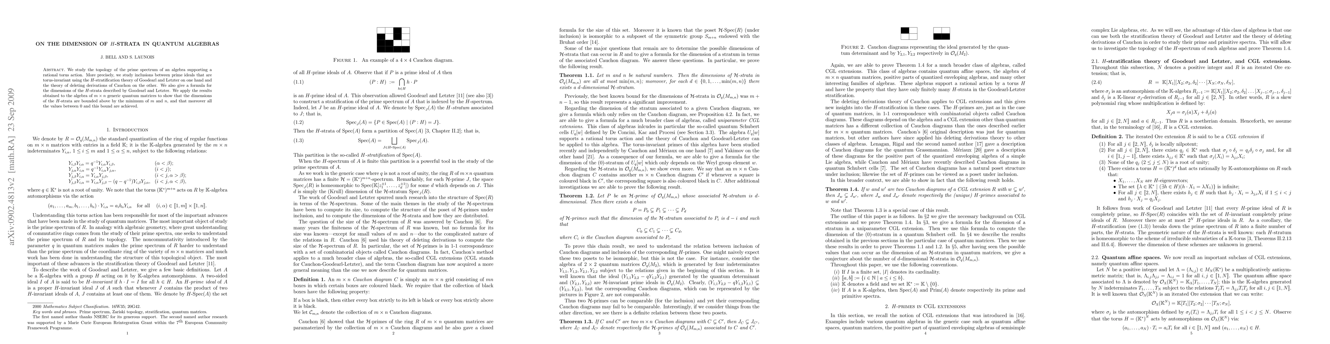 We study the topology of the prime spectrum of an algebra supporting a rational torus action. More precisely, we study inclusions between prime ideals that are torus-invariant using the $H$-stratification theory of Goodearl and Letzter on one hand and the theory of deleting derivations of Cauchon on the other. We apply the results obtained to the algebra of $m \times n$ generic quantum matrices to show that the dimensions of the $H$-strata described by Goodearl and Letzter are bounded above by the minimum of $m$ and $n$, and that moreover all the values between 0 and this bound are achieved.