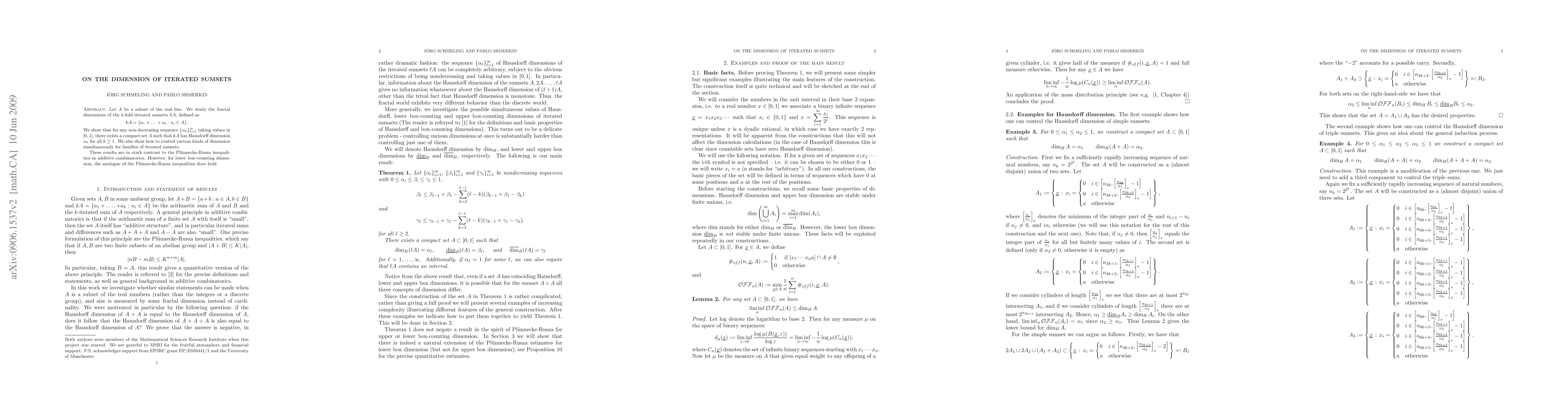 This paper investigates the fractal dimensions of k-fold iterated sumsets of a subset A of the real line, demonstrating the existence of compact sets A with Hausdorff dimension a_k for any non-decreasing sequence {a_k} in [0,1]. It contrasts these findings with Plunnecke-Rusza inequalities in additive combinatorics, while noting that lower box-counting dimension still adheres to similar inequalities.