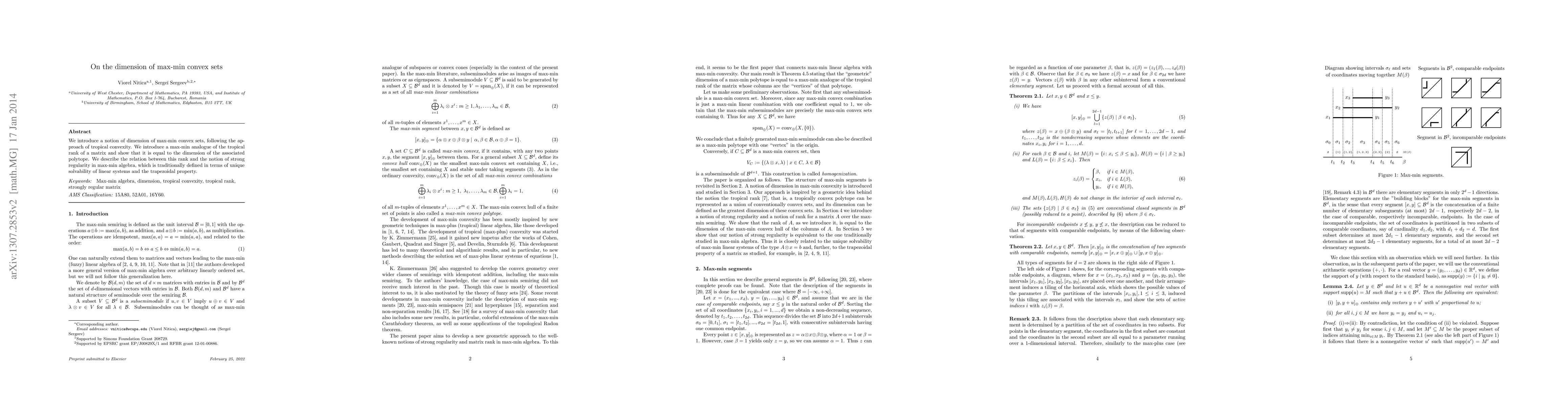 This paper introduces a dimension concept for max-min convex sets based on tropical convexity, defining a max-min analogue of tropical matrix rank that equals the polytope's dimension. It also explores the connection between this rank and strong regularity in max-min algebra, linked to unique solvability and trapezoidal properties.