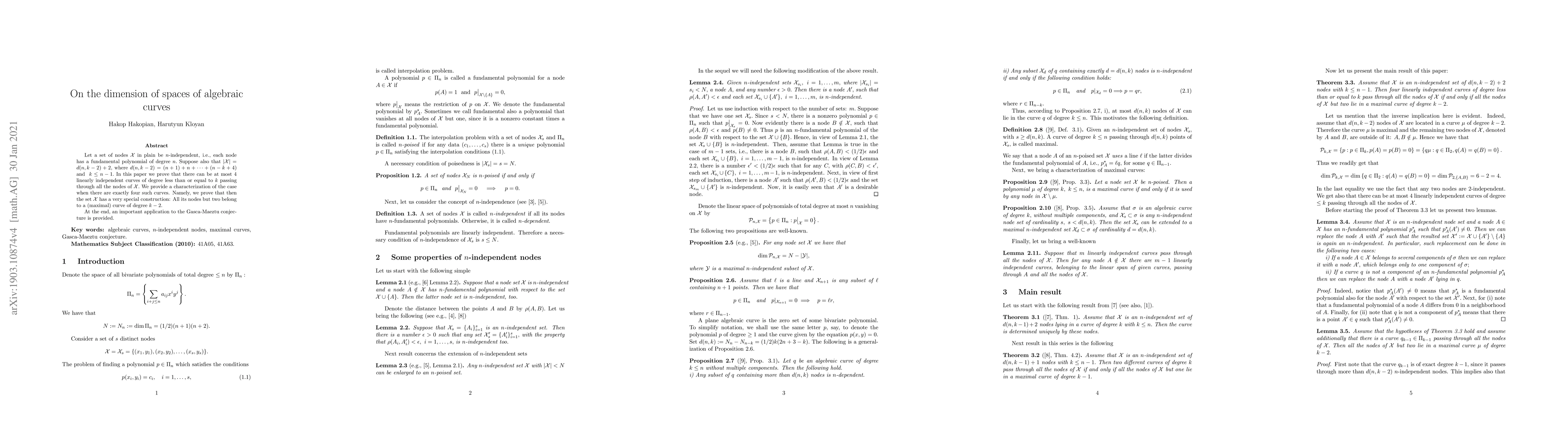 This paper proves that at most four linearly independent curves of degree less than or equal to k can pass through n-independent nodes in a plane, with a special case where exactly four curves exist when most nodes lie on a maximal curve of degree k-2. The findings also contribute to the Gasca-Maeztu conjecture.