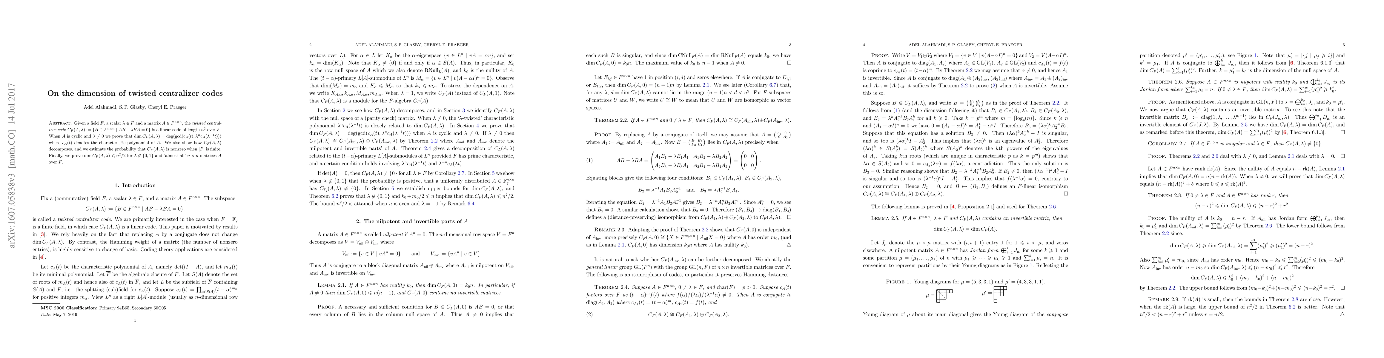 Given a field $F$, a scalar $\lambda\in F$ and a matrix $A\in F^{n\times n}$, the twisted centralizer code $C_F(A,\lambda):=\{B\in F^{n\times n}\mid AB-\lambda BA=0\}$ is a linear code of length $n^2$. When $A$ is cyclic and $\lambda\ne0$ we prove that $\dim C_F(A,\lambda)=\mathrm{deg}(\gcd(c_A(t),\lambda^n c_A(\lambda^{-1}t)))$ where $c_A(t)$ denotes the characteristic polynomial of $A$. We also show how $C_F(A,\lambda)$ decomposes, and we estimate the probability that $C_F(A,\lambda)$ is nonzero when $|F|$ is finite. Finally, we prove $\dim C_F(A,\lambda)\leqslant n^2/2$ for $\lambda\not\in\{0,1\}$ and `almost all' matrices $A$.