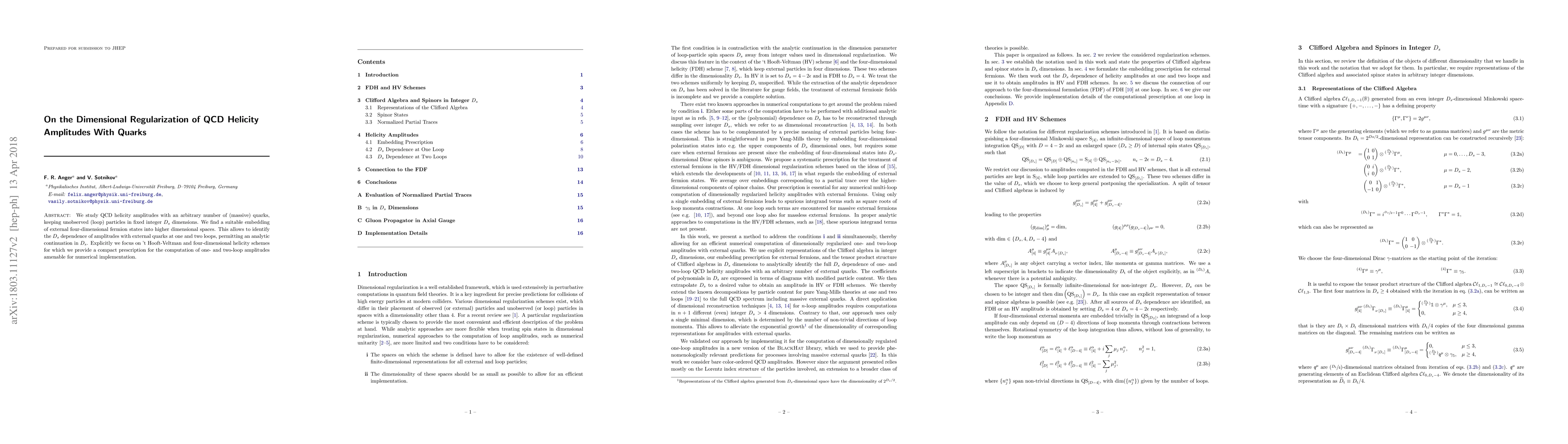 We study QCD helicity amplitudes with an arbitrary number of (massive) quarks, keeping unobserved (loop) particles in fixed integer $D_s$ dimensions. We find a suitable embedding of external four-dimensional fermion states into higher dimensional spaces. This allows to identify the $D_s$ dependence of amplitudes with external quarks at one and two loops, permitting an analytic continuation in $D_s$. Explicitly we focus on 't Hooft-Veltman and four-dimensional helicity schemes for which we provide a compact prescription for the computation of one- and two-loop amplitudes amenable for numerical implementation.