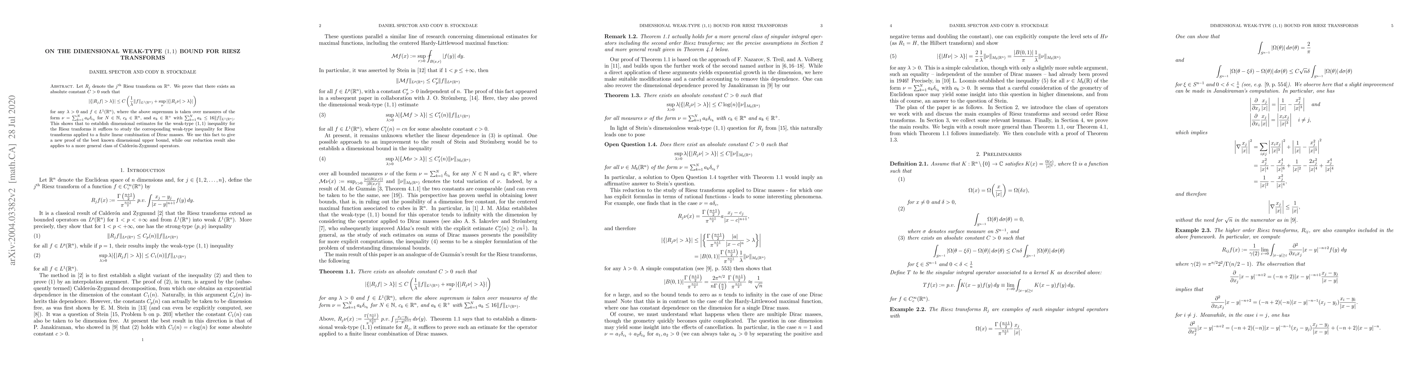 Let $R_j$ denote the $j^{\text{th}}$ Riesz transform on $\mathbb{R}^n$. We prove that there exists an absolute constant $C>0$ such that \begin{align*} |\{|R_jf|>\lambda\}|\leq C\left(\frac{1}{\lambda}\|f\|_{L^1(\mathbb{R}^n)}+\sup_{\nu} |\{|R_j\nu|>\lambda\}|\right) \end{align*} for any $\lambda>0$ and $f \in L^1(\mathbb{R}^n)$, where the above supremum is taken over measures of the form $\nu=\sum_{k=1}^Na_k\delta_{c_k}$ for $N \in \mathbb{N}$, $c_k \in \mathbb{R}^n$, and $a_k \in \mathbb{R}^+$ with $\sum_{k=1}^N a_k \leq 16\|f\|_{L^1(\mathbb{R}^n)}$. This shows that to establish dimensional estimates for the weak-type $(1,1)$ inequality for the Riesz tranforms it suffices to study the corresponding weak-type inequality for Riesz transforms applied to a finite linear combination of Dirac masses. We use this fact to give a new proof of the best known dimensional upper bound, while our reduction result also applies to a more general class of Calder\'on-Zygmund operators.