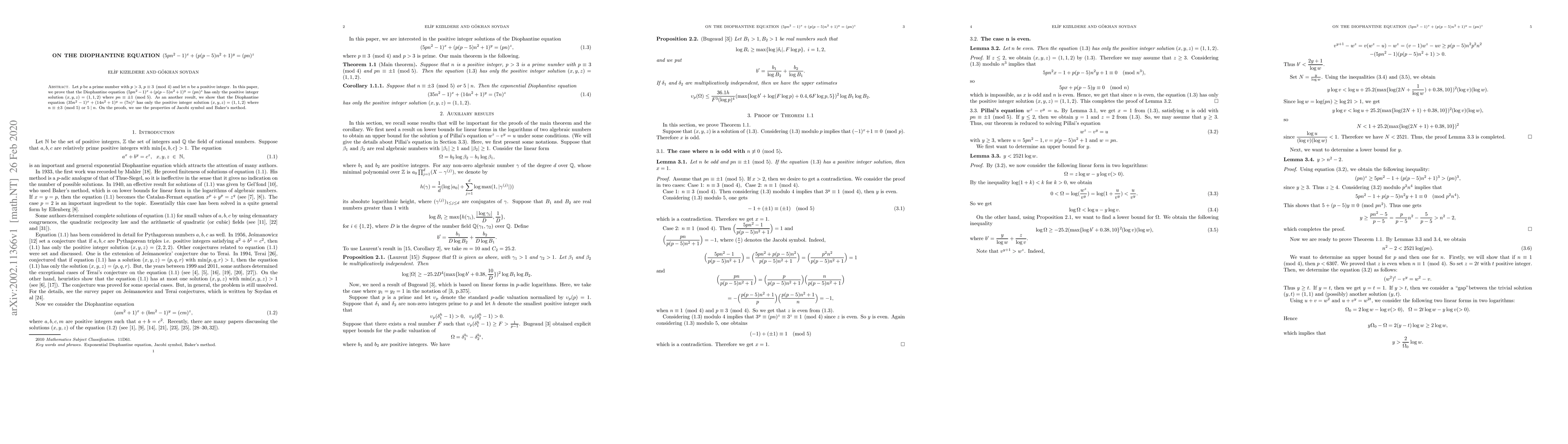 This paper proves that the Diophantine equation $(5pn^{2}-1)^{x}+(p(p-5)n^{2}+1)^{y}=(pn)^{z}$ has only the solution $(x,y,z)=(1,1,2)$ under specific conditions on $p$ and $n$. It also demonstrates a similar result for a modified equation using Jacobi symbol properties and Baker's method.