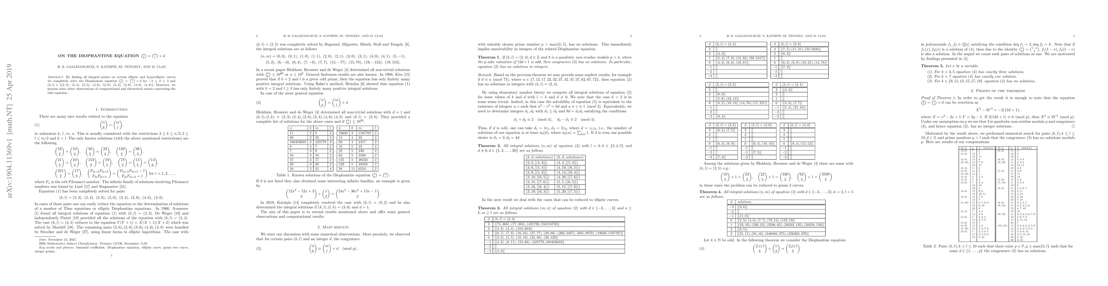 By finding all integral points on certain elliptic and hyperelliptic curves we completely solve the Diophantine equation $\binom{n}{k}=\binom{m}{l}+d$ for $-3\leq d\leq 3$ and $(k,l)\in\{(2,3),\; (2,4),\;(2,5),\; (2,6),\; (2,8),\; (3,4),\; (3,6),\; (4,6), \; (4,8)\}.$ Moreover, we present some other observations of computational and theoretical nature concerning the title equation.