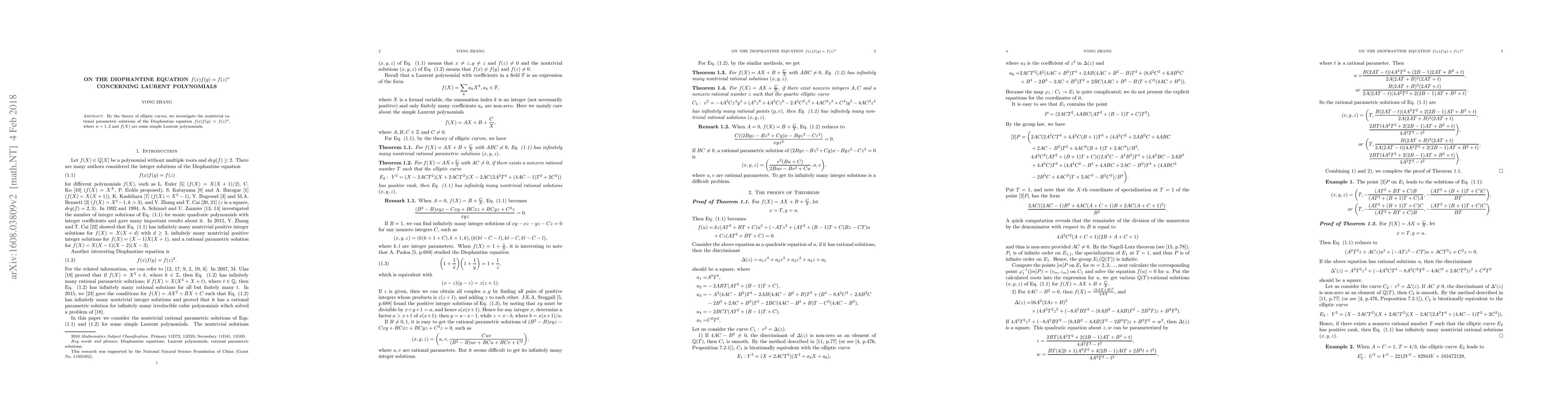 Summary: This research examines the nontrivial rational solutions of the Diophantine equation $f(x)f(y)=f(z)^n$ for $n=1,2$ using elliptic curve theory, where $f(X)$ represents specific Laurent polynomials.